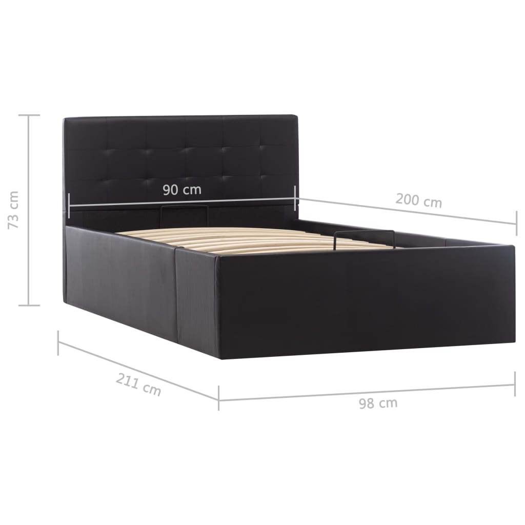 Verleihen Sie Ihrem Schlafzimmer mit diesem hydraulischen Bettgestell aus Kunstleder sofort ein beeindruckendes und modernes Aussehen! Dieses Einzelbett zeichnet sich durch ein schlichtes und zugleich stilvolles Design sowie einer soliden Konstruktion aus, da es aus starkem und robustem MDF gefertigt ist. Dieses Polsterbett verwandelt den ungenutzten Raum unter der Matratze in einen Stauraum mit viel Platz zur Aufbewahrung von Kleidung, Laken, Decken usw. Der hydraulische Gashebemechanismus macht das Anheben der Matratze zum Kinderspiel. Der Lattenrost steht nach dem Anheben aufrecht, sodass Sie beide Hände frei haben, um darunter liegende Gegenstände zu entfernen oder zu verstauen. Der pulverbeschichtete Stahlrahmen und die Sperrholzlatten tragen zur Robustheit und Langlebigkeit des Bettes bei. Das mit glänzendem Kunstleder gepolsterte Bett wirkt einladend und ist pflegeleicht. Dieser Artikel ist leicht zu montieren. Dieses Schlafzimmermöbel ist für eine Matratze von 90×200 cm geeignet. Bitte beachten Sie, dass im Lieferumfang nur das Bettgestell enthalten ist. Eine Matratze ist nicht im Lieferumfang enthalten. In unserem Shop finden Sie die passenden Matratzen.