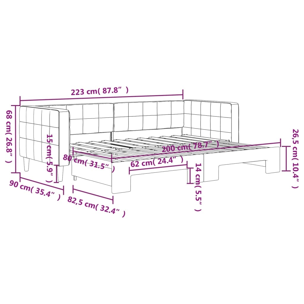 Dieses ausziehbare 2-in-1-Tagesbett, das sowohl als Sofa als auch als Bett dient, ist eine praktische und auffällige Ergänzung zu deinem Wohn- oder Schlafzimmer. Vielseitiges Tagesbett: Das Schlafsofa fungiert tagsüber als Sofa und lässt sich nachts durch Ausziehen des Rollkastens leicht in ein Doppelbett verwandeln - eine praktische Lösung, um Gästen einen bequemen Schlafplatz zu bieten und den Platz zu maximieren.Weicher Samt und robuste Konstruktion: Dieses Schlafsofa besitzt einen stabilen Rahmen aus Holz und Metall und ist mit weichem und bequemem Samt bezogen.Modernes Design: Das Couchbett weist ein modernes Design auf, das sich durch klare Linien, einen minimalistischen Look sowie Natürlichkeit auszeichnet und deiner Einrichtung eine moderne Note verleiht! Gut zu wissen:Matratzen sind bei diesem Bett nicht im Lieferumfang enthalten. Wir bieten jedoch eine große Auswahl an Matratzen an. Du kannst in unserem Shop nach passenden Matratzen suchen.