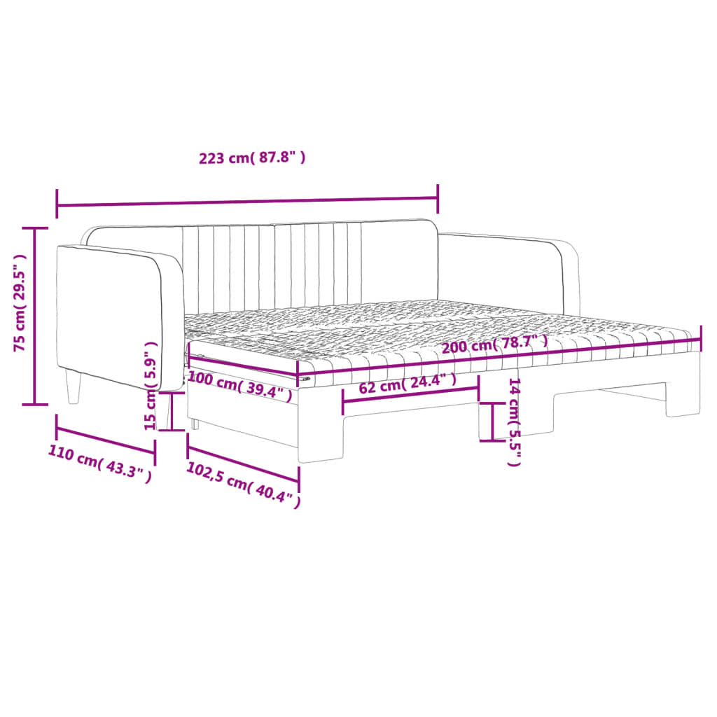Dieses ausziehbare 2-in-1-Tagesbett, das sowohl als Sofa als auch als Bett dient, ist eine praktische und auffällige Ergänzung zu deinem Wohn- oder Schlafzimmer. Vielseitiges Tagesbett: Das Schlafsofa fungiert tagsüber als Sofa und lässt sich nachts durch Ausziehen des Rollkastens leicht in ein Doppelbett verwandeln - eine praktische Lösung, um Gästen einen bequemen Schlafplatz zu bieten und den Platz zu maximieren.Komfortable Schaumstoffmatratze: Dieses Schlafbett wird samt zwei Schaumstoffmatratzen geliefert, die für maximalen Halt und optimalen Komfort sorgen.Weicher Samt und robuste Konstruktion: Dieses Schlafsofa besitzt einen stabilen Rahmen aus Holz und Metall und ist mit weichem und bequemem Samt bezogen.Modernes Design: Das Couchbett weist ein modernes Design auf, das sich durch klare Linien, einen minimalistischen Look sowie Natürlichkeit auszeichnet und deiner Einrichtung eine moderne Note verleiht!