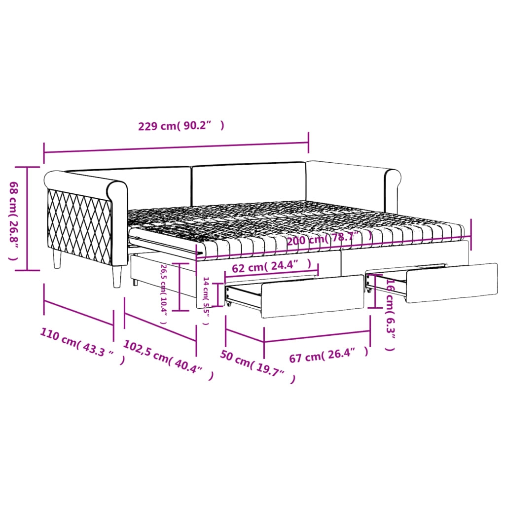 Dieses ausziehbare 2-in-1-Tagesbett, das sowohl als Sofa als auch als Bett dient, ist eine praktische und auffällige Ergänzung zu deinem Wohn- oder Schlafzimmer. Vielseitiges Tagesbett: Das Schlafsofa fungiert tagsüber als Sofa und lässt sich nachts durch Ausziehen des Rollkastens leicht in ein Doppelbett verwandeln - eine praktische Lösung, um Gästen einen bequemen Schlafplatz zu bieten und den Platz zu maximieren.Reichlich Stauraum: Dieses Gästebett verfügt über zwei Schubladen mit Rollen, die reichlich Stauraum für Kleidung, Socken, Spielzeug, Kissen usw. bieten.Komfortable Schaumstoffmatratze: Dieses Schlafbett wird samt zwei Schaumstoffmatratzen geliefert, die für maximalen Halt und optimalen Komfort sorgen.Weicher Samt und robuste Konstruktion: Dieses Schlafsofa besitzt einen stabilen Rahmen aus Holz und Metall und ist mit weichem und bequemem Samt bezogen.