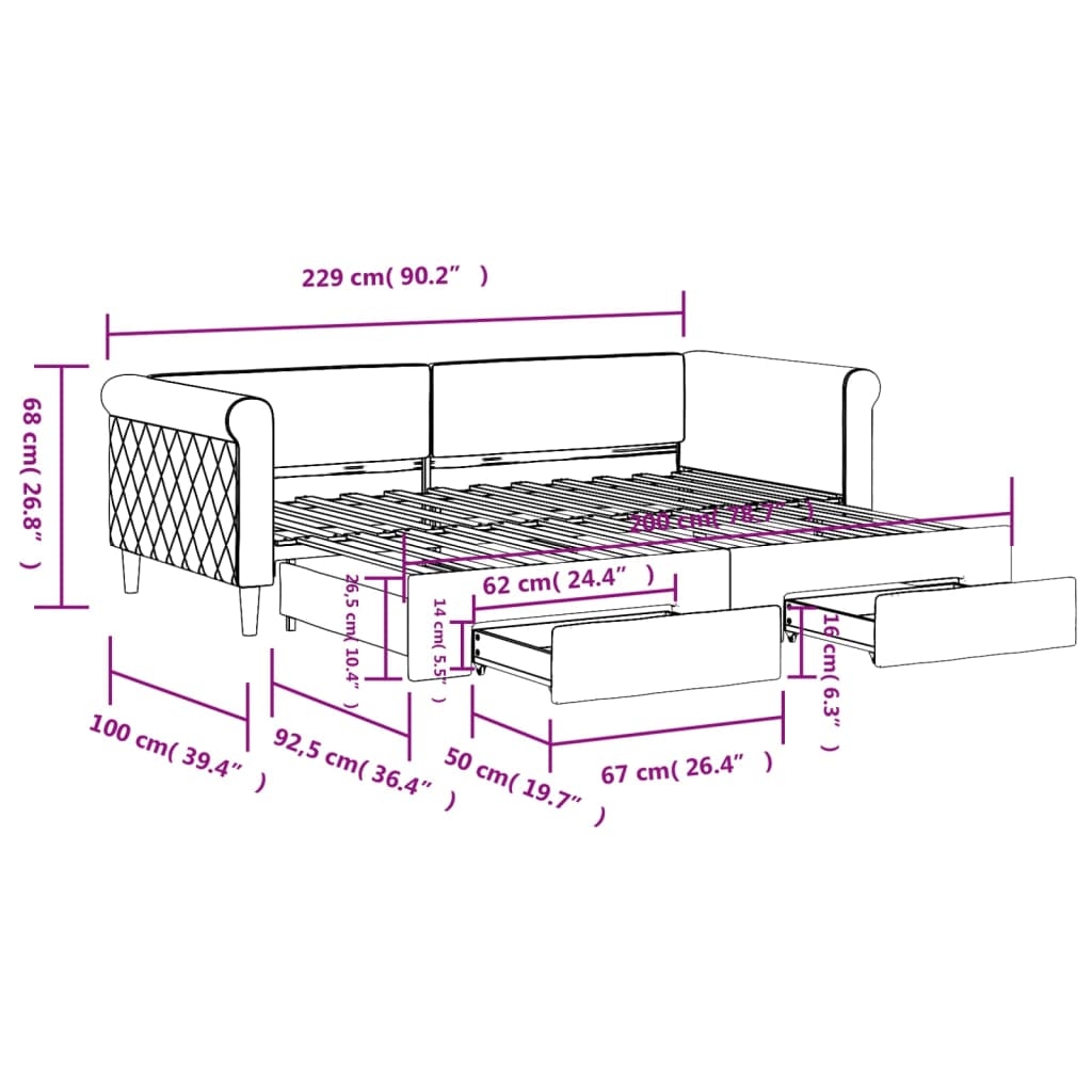 Dieses ausziehbare 2-in-1-Tagesbett, das sowohl als Sofa als auch als Bett dient, ist eine praktische und auffällige Ergänzung zu deinem Wohn- oder Schlafzimmer. Vielseitiges Tagesbett: Das Schlafsofa fungiert tagsüber als Sofa und lässt sich nachts durch Ausziehen des Rollkastens leicht in ein Doppelbett verwandeln - eine praktische Lösung, um Gästen einen bequemen Schlafplatz zu bieten und den Platz zu maximieren.Reichlich Stauraum: Dieses Gästebett verfügt über zwei Schubladen mit Rollen, die reichlich Stauraum für Kleidung, Socken, Spielzeug, Kissen usw. bieten.Weicher Samt und robuste Konstruktion: Dieses Schlafsofa besitzt einen stabilen Rahmen aus Holz und Metall und ist mit weichem und bequemem Samt bezogen.Modernes Design: Das Couchbett weist ein modernes Design auf, das sich durch klare Linien, einen minimalistischen Look sowie Natürlichkeit auszeichnet und deiner Einrichtung eine moderne Note verleiht! Gut zu wissen:Matratzen sind bei diesem Bett nicht im Lieferumfang enthalten. Wir bieten jedoch eine große Auswahl an Matratzen an. Du kannst in unserem Shop nach passenden Matratzen suchen.