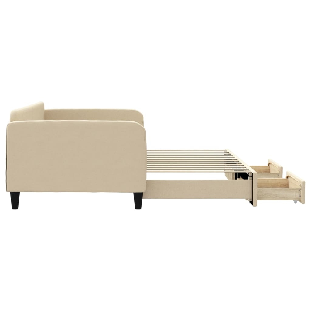 Dieses ausziehbare 2-in-1-Tagesbett, das sowohl als Sofa als auch als Bett dient, ist eine praktische und auffällige Ergänzung zu deinem Wohn- oder Schlafzimmer. Vielseitiges Tagesbett: Das Schlafsofa fungiert tagsüber als Sofa und lässt sich nachts durch Ausziehen des Rollkastens leicht in ein Doppelbett verwandeln - eine praktische Lösung, um Gästen einen bequemen Schlafplatz zu bieten und den Platz zu maximieren.Reichlich Stauraum: Dieses Gästebett verfügt über zwei Schubladen mit Rollen, die reichlich Stauraum für Kleidung, Socken, Spielzeug, Kissen usw. bieten.Strapazierfähiger Stoff und robuste Konstruktion: Dieses Tagesbettsofa besitzt einen stabilen Rahmen aus Holz und Metall und ist mit strapazierfähigem und bequemem Stoff bezogen. Gut zu wissen:Die Matratzen sind nicht im Lieferumfang dieses Bettes enthalten. Wir bieten jedoch eine große Auswahl an Matratzen an. Du kannst in unserem Shop nach passenden Matratzen suchen.