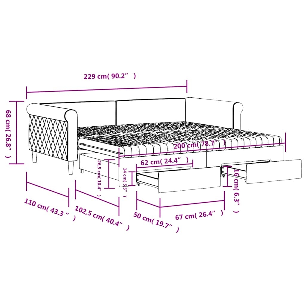 Dieses ausziehbare 2-in-1-Tagesbett, das sowohl als Sofa als auch als Bett dient, ist eine praktische und auffällige Ergänzung zu deinem Wohn- oder Schlafzimmer. Vielseitiges Tagesbett: Das Schlafsofa fungiert tagsüber als Sofa und lässt sich nachts durch Ausziehen des Rollkastens leicht in ein Doppelbett verwandeln - eine praktische Lösung, um Gästen einen bequemen Schlafplatz zu bieten und den Platz zu maximieren.Reichlich Stauraum: Dieses Gästebett verfügt über zwei Schubladen mit Rollen, die reichlich Stauraum für Kleidung, Socken, Spielzeug, Kissen usw. bieten.Komfortable Schaumstoffmatratze: Dieses Schlafbett wird samt zwei Schaumstoffmatratzen geliefert, die für maximalen Halt und optimalen Komfort sorgen.Weicher Samt und robuste Konstruktion: Dieses Schlafsofa besitzt einen stabilen Rahmen aus Holz und Metall und ist mit weichem und bequemem Samt bezogen.