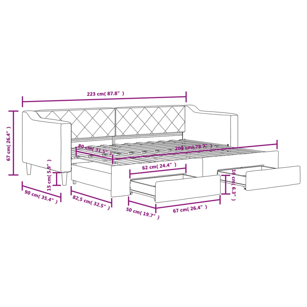 Dieses ausziehbare 2-in-1-Tagesbett, das sowohl als Sofa als auch als Bett dient, ist eine praktische und auffällige Ergänzung zu deinem Wohn- oder Schlafzimmer. Vielseitiges Tagesbett: Das Schlafsofa fungiert tagsüber als Sofa und lässt sich nachts durch Ausziehen des Rollkastens leicht in ein Doppelbett verwandeln - eine praktische Lösung, um Gästen einen bequemen Schlafplatz zu bieten und den Platz zu maximieren. Reichlich Stauraum: Dieses Gästebett verfügt über zwei Schubladen mit Rollen, die reichlich Stauraum für Kleidung, Socken, Spielzeug, Kissen usw. bieten. Strapazierfähiger Stoff und robuste Konstruktion: Dieses Tagesbettsofa besitzt einen stabilen Rahmen aus Holz und Metall und ist mit strapazierfähigem und bequemem Stoff bezogen.Modernes Design: Das Sofabett weist ein modernes Design auf, das sich durch klare Linien und einen minimalistischen Look auszeichnet und deiner Einrichtung eine moderne Note verleihen wird! Gut zu wissen:Matratzen sind bei diesem Bett nicht im Lieferumfang enthalten. Wir bieten jedoch eine große Auswahl an Matratzen an. Du kannst in unserem Shop nach passenden Matratzen suchen.