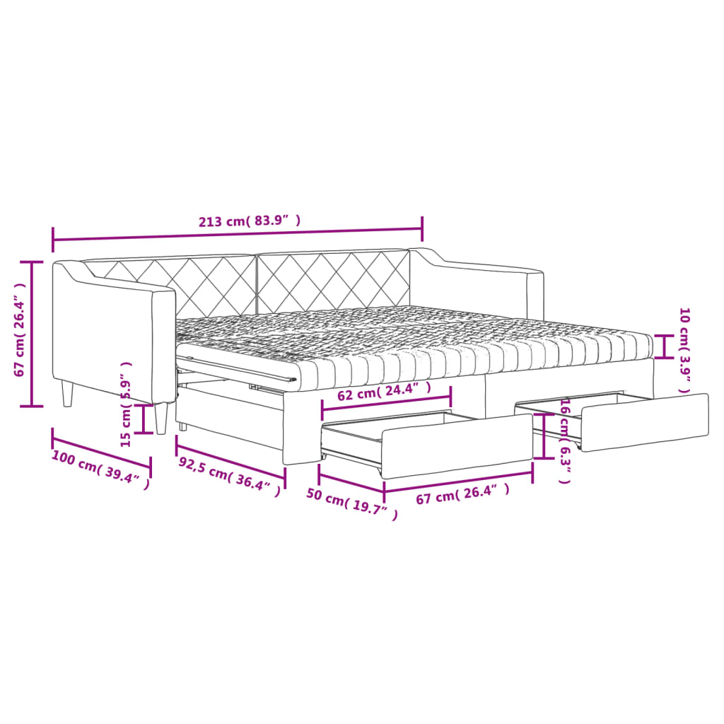 Dieses ausziehbare 2-in-1-Tagesbett, das sowohl als Sofa als auch als Bett dient, ist eine praktische und auffällige Ergänzung zu deinem Wohn- oder Schlafzimmer. Vielseitiges Tagesbett: Das Schlafsofa fungiert tagsüber als Sofa und lässt sich nachts durch Ausziehen des Rollkastens leicht in ein Doppelbett verwandeln - eine praktische Lösung, um Gästen einen bequemen Schlafplatz zu bieten und den Platz zu maximieren. Reichlich Stauraum: Dieses Gästebett verfügt über zwei Schubladen mit Rollen, die reichlich Stauraum für Kleidung, Socken, Spielzeug, Kissen usw. bieten. Komfortable Schaumstoffmatratze: Dieses Schlafbett wird samt zwei Schaumstoffmatratzen geliefert, die für maximalen Halt und optimalen Komfort sorgen. Strapazierfähiger Stoff und robuste Konstruktion: Dieses Tagesbettsofa besitzt einen stabilen Rahmen aus Holz und Metall und ist mit strapazierfähigem und bequemem Stoff bezogen.