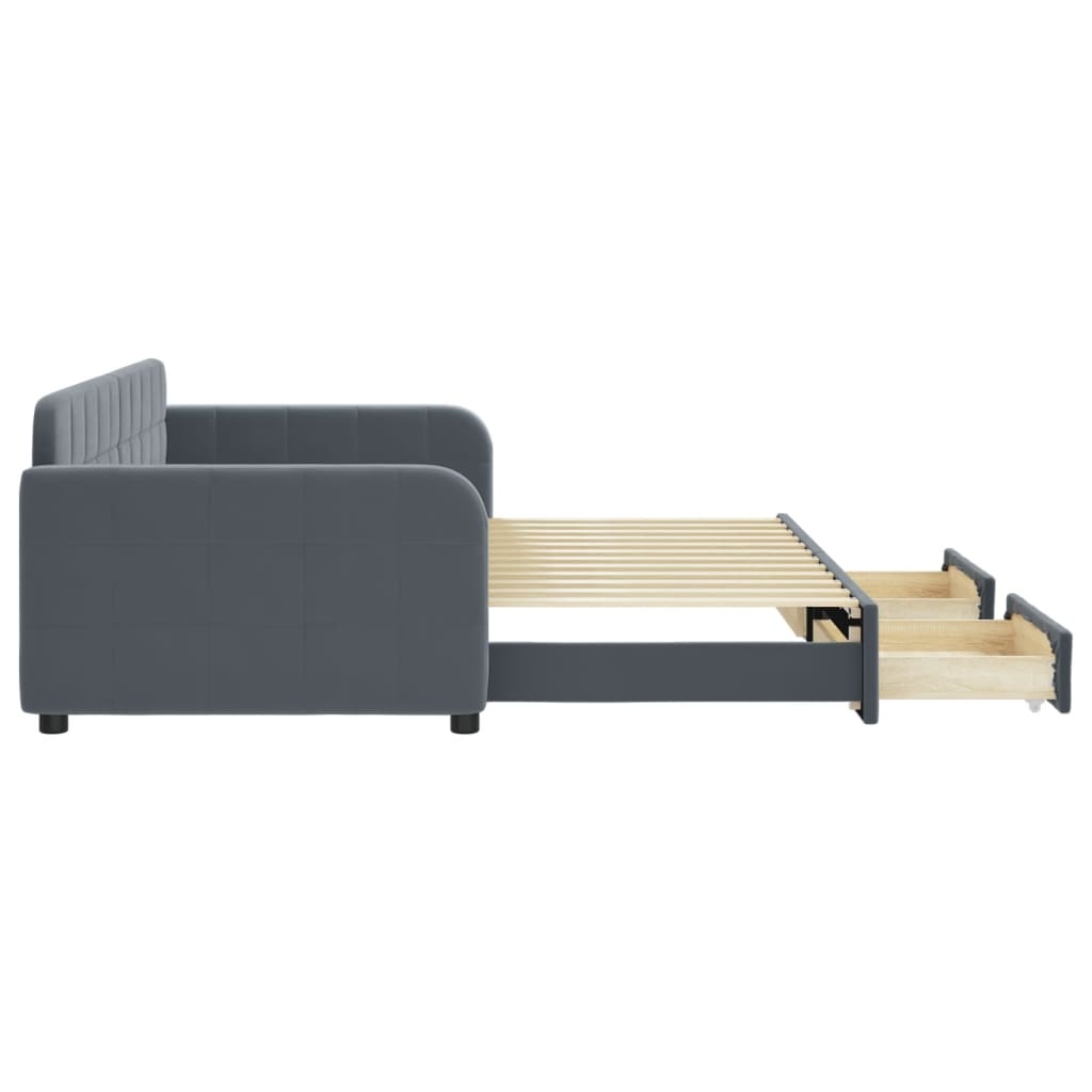 Dieses ausziehbare 2-in-1-Tagesbett, das sowohl als Sofa als auch als Bett dient, ist eine praktische und auffällige Ergänzung zu deinem Wohn- oder Schlafzimmer. Vielseitiges Tagesbett: Das Schlafsofa fungiert tagsüber als Sofa und lässt sich nachts durch Ausziehen des Rollkastens leicht in ein Doppelbett verwandeln - eine praktische Lösung, um Gästen einen bequemen Schlafplatz zu bieten und den Platz zu maximieren. Reichlich Stauraum: Dieses Gästebett verfügt über zwei Schubladen mit Rollen, die reichlich Stauraum für Kleidung, Socken, Spielzeug, Kissen usw. bieten.Weicher Samt und robuste Konstruktion: Dieses Schlafsofa besitzt einen stabilen Rahmen aus Holz und Metall und ist mit weichem und bequemem Samt bezogen. Gut zu wissen:Matratzen sind bei diesem Bett nicht im Lieferumfang enthalten. Wir bieten jedoch eine große Auswahl an Matratzen an. Du kannst in unserem Shop nach passenden Matratzen suchen.