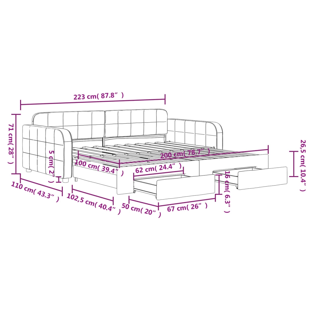 Dieses ausziehbare 2-in-1-Tagesbett, das sowohl als Sofa als auch als Bett dient, ist eine praktische und auffällige Ergänzung zu deinem Wohn- oder Schlafzimmer. Vielseitiges Tagesbett: Das Schlafsofa fungiert tagsüber als Sofa und lässt sich nachts durch Ausziehen des Rollkastens leicht in ein Doppelbett verwandeln - eine praktische Lösung, um Gästen einen bequemen Schlafplatz zu bieten und den Platz zu maximieren. Reichlich Stauraum: Dieses Gästebett verfügt über zwei Schubladen mit Rollen, die reichlich Stauraum für Kleidung, Socken, Spielzeug, Kissen usw. bieten.Weicher Samt und robuste Konstruktion: Dieses Schlafsofa besitzt einen stabilen Rahmen aus Holz und Metall und ist mit weichem und bequemem Samt bezogen. Gut zu wissen:Matratzen sind bei diesem Bett nicht im Lieferumfang enthalten. Wir bieten jedoch eine große Auswahl an Matratzen an. Du kannst in unserem Shop nach passenden Matratzen suchen.