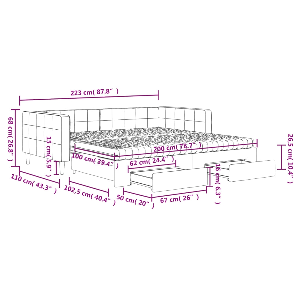 Dieses ausziehbare 2-in-1-Tagesbett, das sowohl als Sofa als auch als Bett dient, ist eine praktische und auffällige Ergänzung zu deinem Wohn- oder Schlafzimmer. Vielseitiges Tagesbett: Das Schlafsofa fungiert tagsüber als Sofa und lässt sich nachts durch Ausziehen des Rollkastens leicht in ein Doppelbett verwandeln - eine praktische Lösung, um Gästen einen bequemen Schlafplatz zu bieten und den Platz zu maximieren.Reichlich Stauraum: Dieses Gästebett verfügt über zwei Schubladen mit Rollen, die reichlich Stauraum für Kleidung, Socken, Spielzeug, Kissen usw. bieten.Komfortable Schaumstoffmatratze: Dieses Schlafbett wird samt zwei Schaumstoffmatratzen geliefert, die für maximalen Halt und optimalen Komfort sorgen.Weicher Samt und robuste Konstruktion: Dieses Schlafsofa besitzt einen stabilen Rahmen aus Holz und Metall und ist mit weichem und bequemem Samt bezogen.