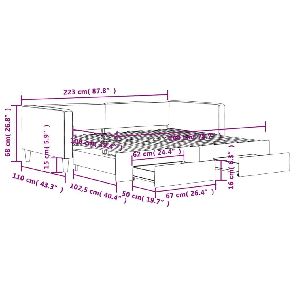 Dieses ausziehbare 2-in-1-Tagesbett, das sowohl als Sofa als auch als Bett dient, ist eine praktische und auffällige Ergänzung zu deinem Wohn- oder Schlafzimmer. Vielseitiges Tagesbett: Das Schlafsofa fungiert tagsüber als Sofa und lässt sich nachts durch Ausziehen des Rollkastens leicht in ein Doppelbett verwandeln - eine praktische Lösung, um Gästen einen bequemen Schlafplatz zu bieten und den Platz zu maximieren. Reichlich Stauraum: Dieses Gästebett verfügt über zwei Schubladen mit Rollen, die reichlich Stauraum für Kleidung, Socken, Spielzeug, Kissen usw. bieten. Strapazierfähiger Stoff und robuste Konstruktion: Dieses Tagesbettsofa besitzt einen stabilen Rahmen aus Holz und Metall und ist mit strapazierfähigem und bequemem Stoff bezogen. Gut zu wissen:Die Matratzen sind nicht im Lieferumfang dieses Bettes enthalten. Wir bieten jedoch eine große Auswahl an Matratzen an. Du kannst in unserem Shop nach passenden Matratzen suchen.
