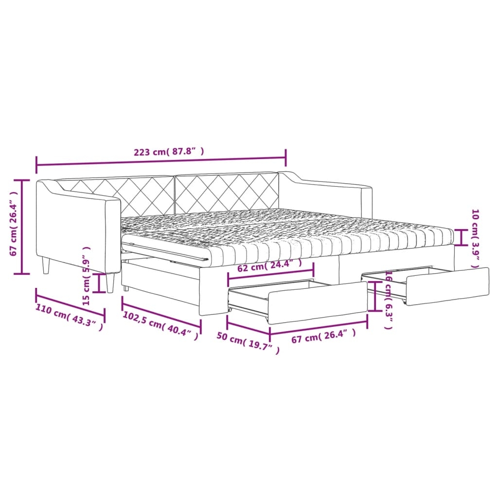 Dieses ausziehbare 2-in-1-Tagesbett, das sowohl als Sofa als auch als Bett dient, ist eine praktische und auffällige Ergänzung zu deinem Wohn- oder Schlafzimmer. Vielseitiges Tagesbett: Das Schlafsofa fungiert tagsüber als Sofa und lässt sich nachts durch Ausziehen des Rollkastens leicht in ein Doppelbett verwandeln - eine praktische Lösung, um Gästen einen bequemen Schlafplatz zu bieten und den Platz zu maximieren. Reichlich Stauraum: Dieses Gästebett verfügt über zwei Schubladen mit Rollen, die reichlich Stauraum für Kleidung, Socken, Spielzeug, Kissen usw. bieten. Komfortable Schaumstoffmatratze: Dieses Schlafbett wird samt zwei Schaumstoffmatratzen geliefert, die für maximalen Halt und optimalen Komfort sorgen. Strapazierfähiger Stoff und robuste Konstruktion: Dieses Tagesbettsofa besitzt einen stabilen Rahmen aus Holz und Metall und ist mit strapazierfähigem und bequemem Stoff bezogen.