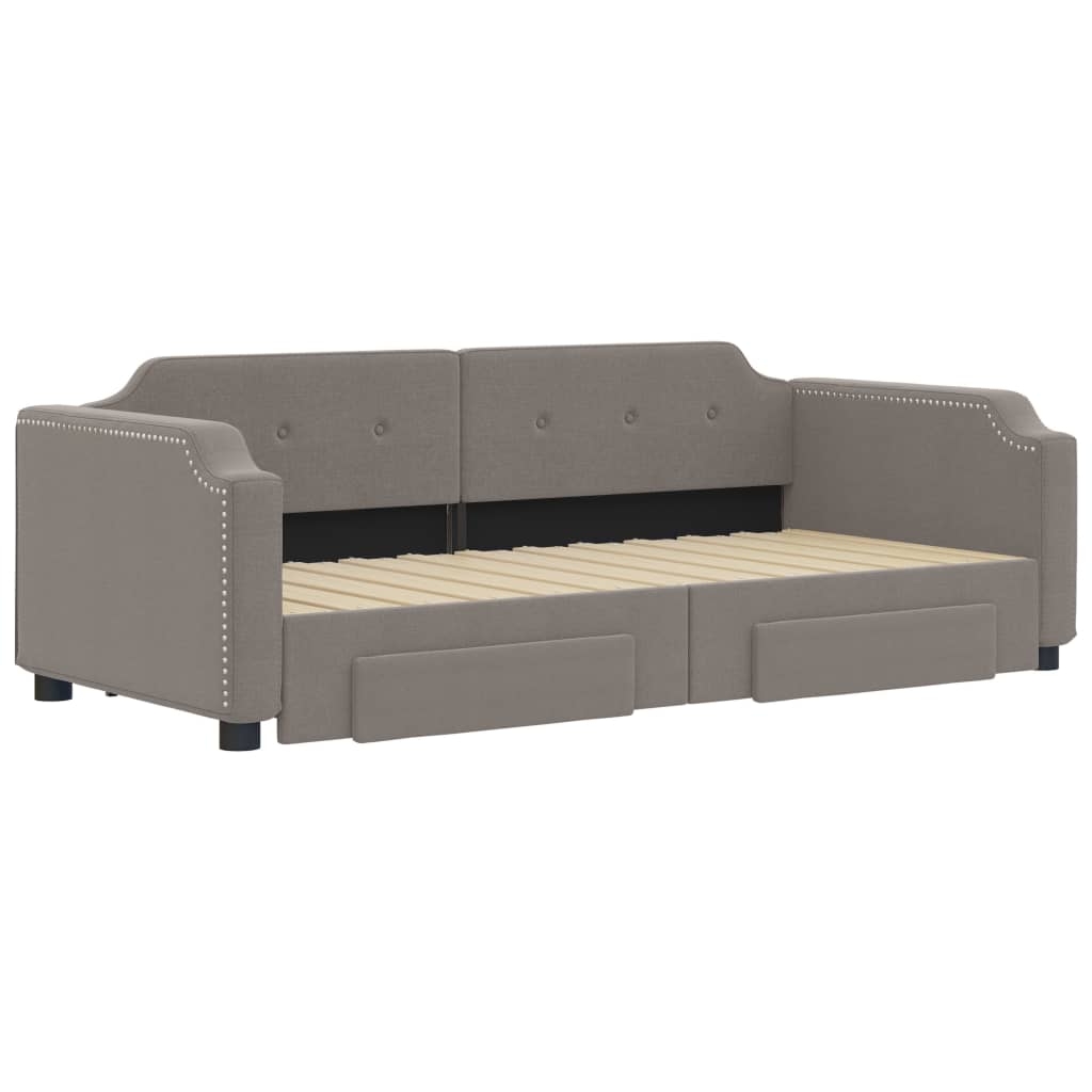 Dieses ausziehbare 2-in-1-Tagesbett, das sowohl als Sofa als auch als Bett dient, ist eine praktische und auffällige Ergänzung zu deinem Wohn- oder Schlafzimmer. Vielseitiges Tagesbett: Das Schlafsofa fungiert tagsüber als Sofa und lässt sich nachts durch Ausziehen des Rollkastens leicht in ein Doppelbett verwandeln - eine praktische Lösung, um Gästen einen bequemen Schlafplatz zu bieten und den Platz zu maximieren. Reichlich Stauraum: Dieses Gästebett verfügt über zwei Schubladen mit Rollen, die reichlich Stauraum für Kleidung, Socken, Spielzeug, Kissen usw. bieten. Strapazierfähiger Stoff und robuste Konstruktion: Dieses Tagesbettsofa besitzt einen stabilen Rahmen aus Holz und Metall und ist mit strapazierfähigem und bequemem Stoff bezogen. Gut zu wissen:Die Matratzen sind nicht im Lieferumfang dieses Bettes enthalten. Wir bieten jedoch eine große Auswahl an Matratzen an. Du kannst in unserem Shop nach passenden Matratzen suchen.