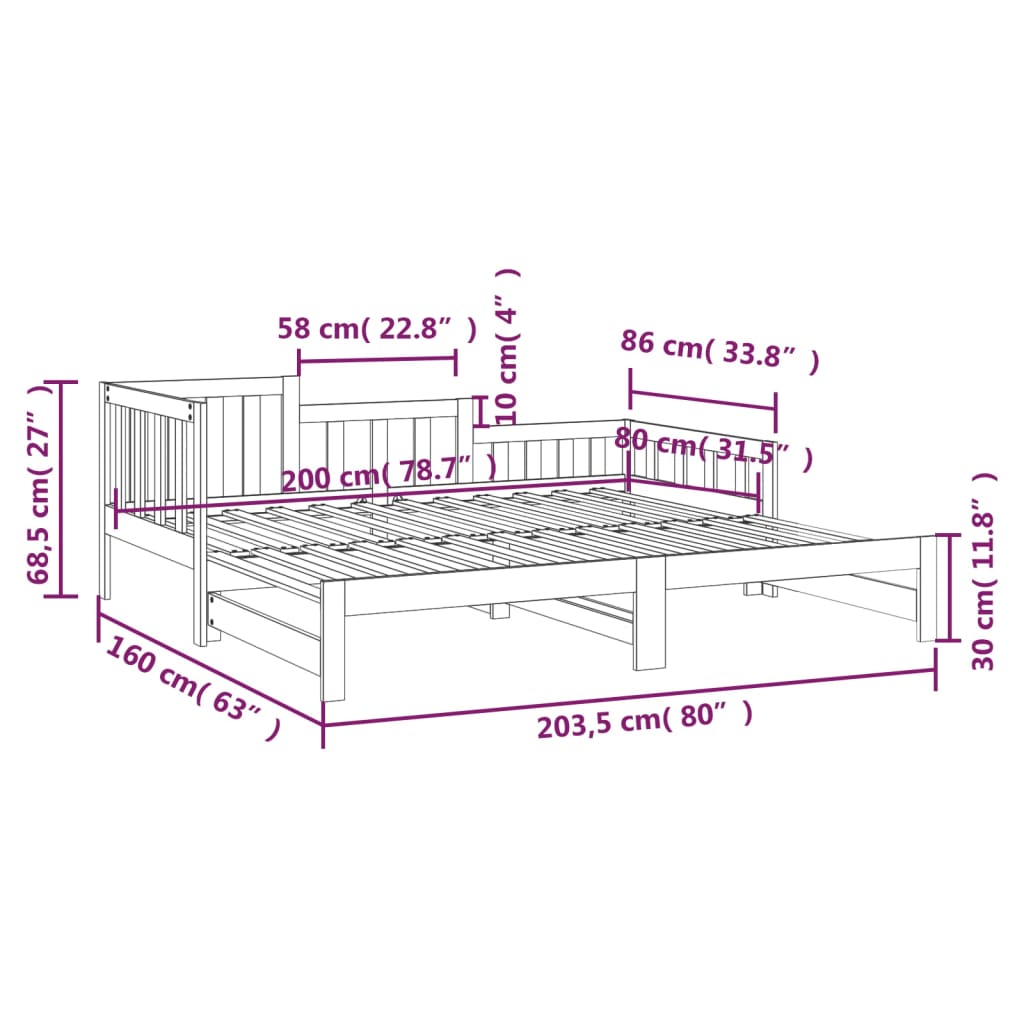 - Abmessungen des Tagesbettes (nicht ausgezogen): 203,5 x 86 x 68,5 cm (L x B x H)