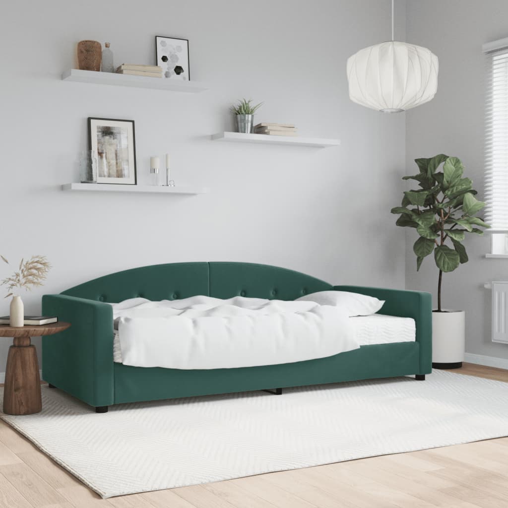 Dieses 2-in-1-Tagesbett mit Matratze, das sowohl als Sofa als auch als Bett dient, ist eine praktische und auffällige Ergänzung zu deinem Wohn- oder Schlafzimmer. Vielseitiges Tagesbett: Das Schlafsofa fungiert tagsüber als Sofa und lässt sich nachts leicht in ein Bett umwandeln - eine praktische Lösung, um Gästen einen bequemen Schlafplatz zu bieten und den Platz zu maximieren.Komfortable Schaumstoffmatratze: Dieses Bett wird samt einer Schaumstoffmatratze geliefert, die maximalen Halt und optimalen Komfort bietet. Weicher Samt und robuste Konstruktion: Dieses Schlafsofa besitzt einen stabilen Rahmen aus Holz und Metall und ist mit weichem und bequemem Samt bezogen.