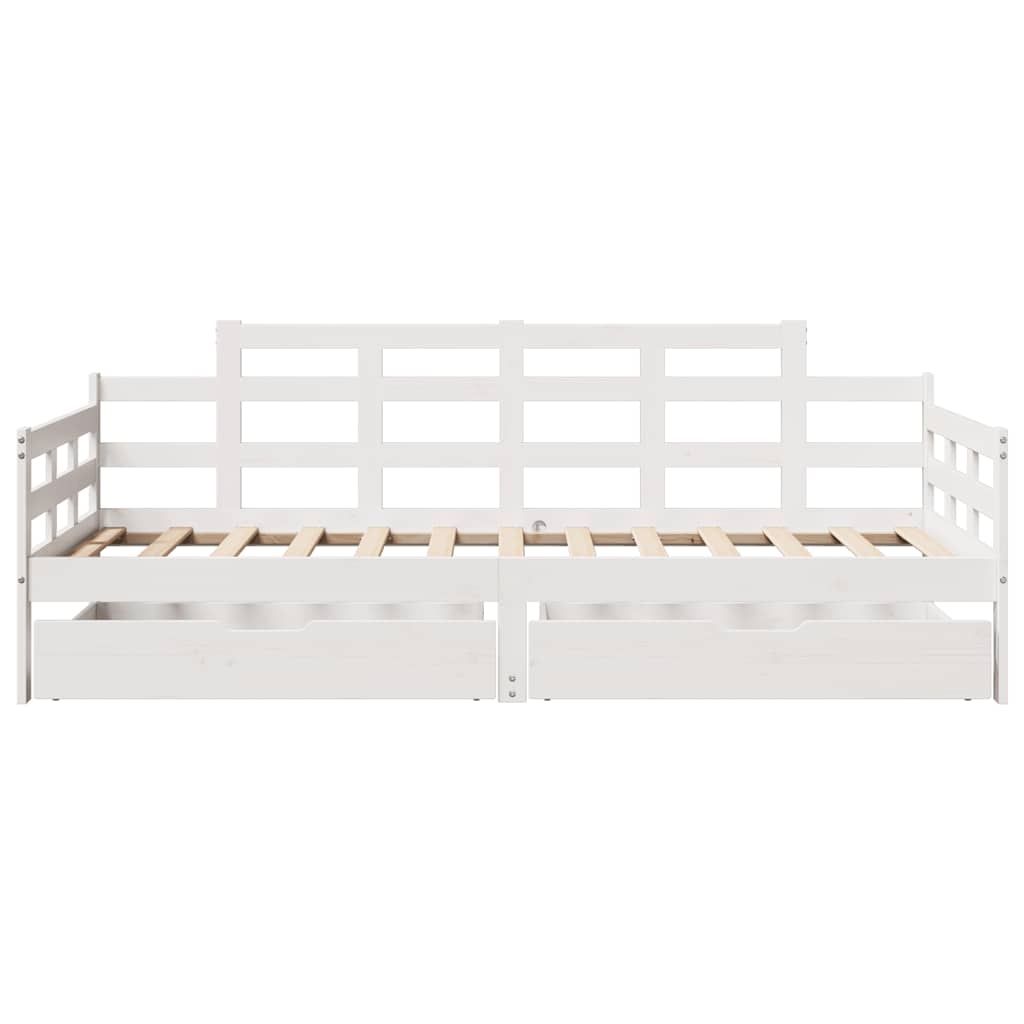 Dieses ausziehbare 2-in-1 Tagesbett mit Schubladen, das sowohl als Sofa als auch als Bett dient, wird ein praktisches und auffälliges Möbel in deinem Wohn- oder Schlafzimmer. Stabiles und langlebiges Gestell: Massives Kiefernholz ist für seine Stärke und Haltbarkeit bekannt. Seine gerade Maserung und die charakteristischen Aststellen tragen zu seinem rustikalen Charme bei.Bettgitter auf 3 Seiten: Mit seinen seitlichen Bettgittern weist dieses Gästebett ein einzigartiges Design auf, das ein Gefühl der Sicherheit vermittelt und deinem Zuhause einen Hauch von raffiniertem Stil verleiht.Latten für optimale Unterstützung: Das Sofabett ist mit Latten ausgestattet, die deine Matratze optimal stützen und auch für Atmungsaktivität sorgen.Rustikaler Charme: Das Schlafsofa verleiht deinem Zuhause einen ländlichen Charme, der sehr entspannend sein kann. Die beruhigende Wirkung dieses hölzernen Schlafsofas verwandelt jedes Schlafzimmer oder Gästezimmer in einen beruhigenden Ort und verleiht dem Raum ein natürliches Element.Reichlich Stauraum: Dieses Gästebett verfügt über zwei Schubladen, die reichlich Stauraum für Kleidung, Socken, Spielzeug, Kissen usw. bieten. Gut zu wissen:Matratzen sind bei diesem Bett nicht im Lieferumfang enthalten. Wir bieten jedoch eine große Auswahl an Matratzen an. Du kannst in unserem Shop nach passenden Matratzen suchen.