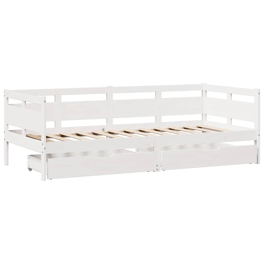 Dieses ausziehbare 2-in-1 Tagesbett mit Schubladen, das sowohl als Sofa als auch als Bett dient, wird ein praktisches und auffälliges Möbel in deinem Wohn- oder Schlafzimmer. Stabiles und langlebiges Gestell: Massives Kiefernholz ist für seine Stärke und Haltbarkeit bekannt. Seine gerade Maserung und die charakteristischen Aststellen tragen zu seinem rustikalen Charme bei.Bettgitter auf 3 Seiten: Mit seinen seitlichen Bettgittern weist dieses Gästebett ein einzigartiges Design auf, das ein Gefühl der Sicherheit vermittelt und deinem Zuhause einen Hauch von raffiniertem Stil verleiht.Latten für optimale Unterstützung: Das Sofabett ist mit Latten ausgestattet, die deine Matratze optimal stützen und auch für Atmungsaktivität sorgen.Rustikaler Charme: Das Schlafsofa verleiht deinem Zuhause einen ländlichen Charme, der sehr entspannend sein kann. Die beruhigende Wirkung dieses hölzernen Schlafsofas verwandelt jedes Schlafzimmer oder Gästezimmer in einen beruhigenden Ort und verleiht dem Raum ein natürliches Element.Reichlich Stauraum: Dieses Gästebett verfügt über zwei Schubladen, die reichlich Stauraum für Kleidung, Socken, Spielzeug, Kissen usw. bieten. Gut zu wissen:Matratzen sind bei diesem Bett nicht im Lieferumfang enthalten. Wir bieten jedoch eine große Auswahl an Matratzen an. Du kannst in unserem Shop nach passenden Matratzen suchen.