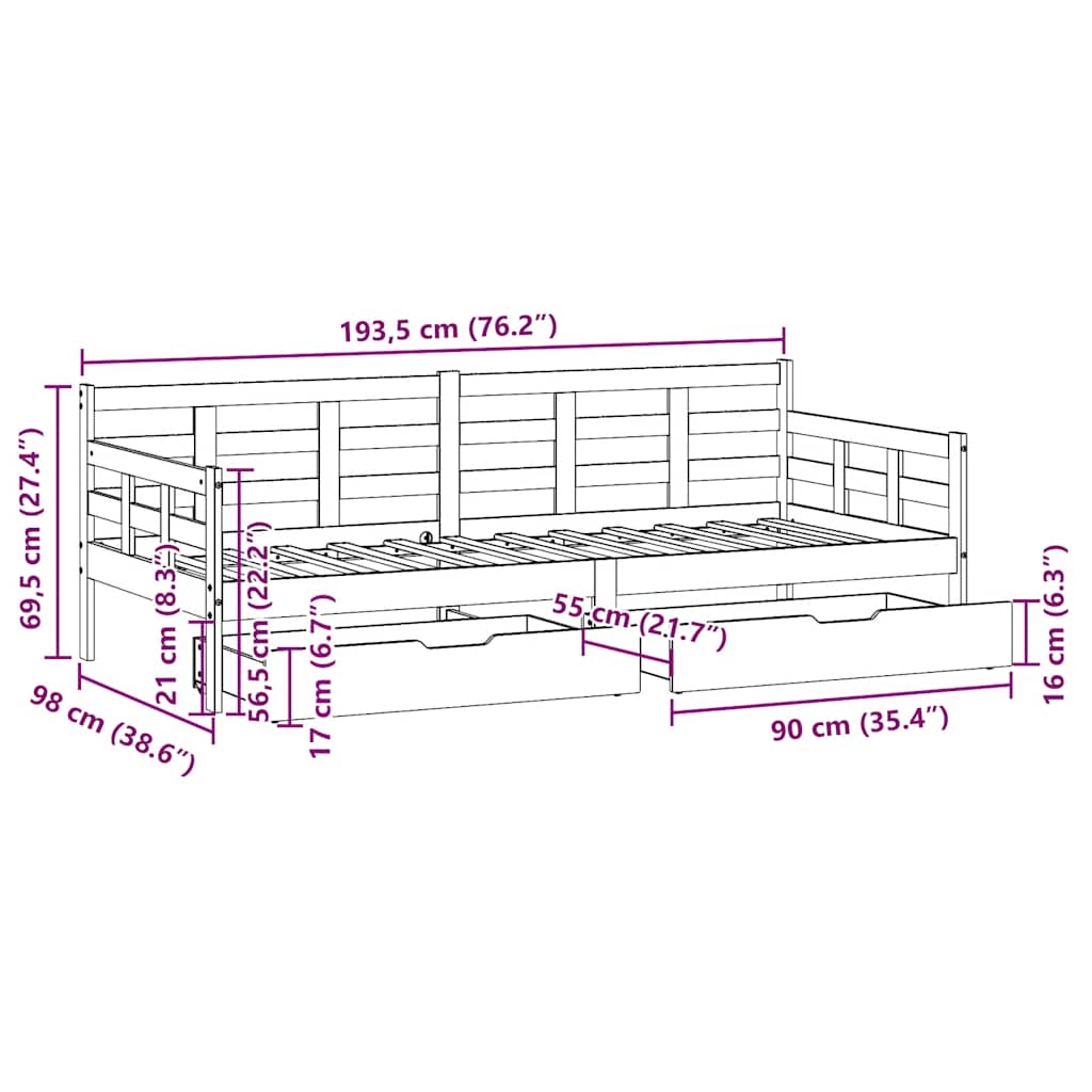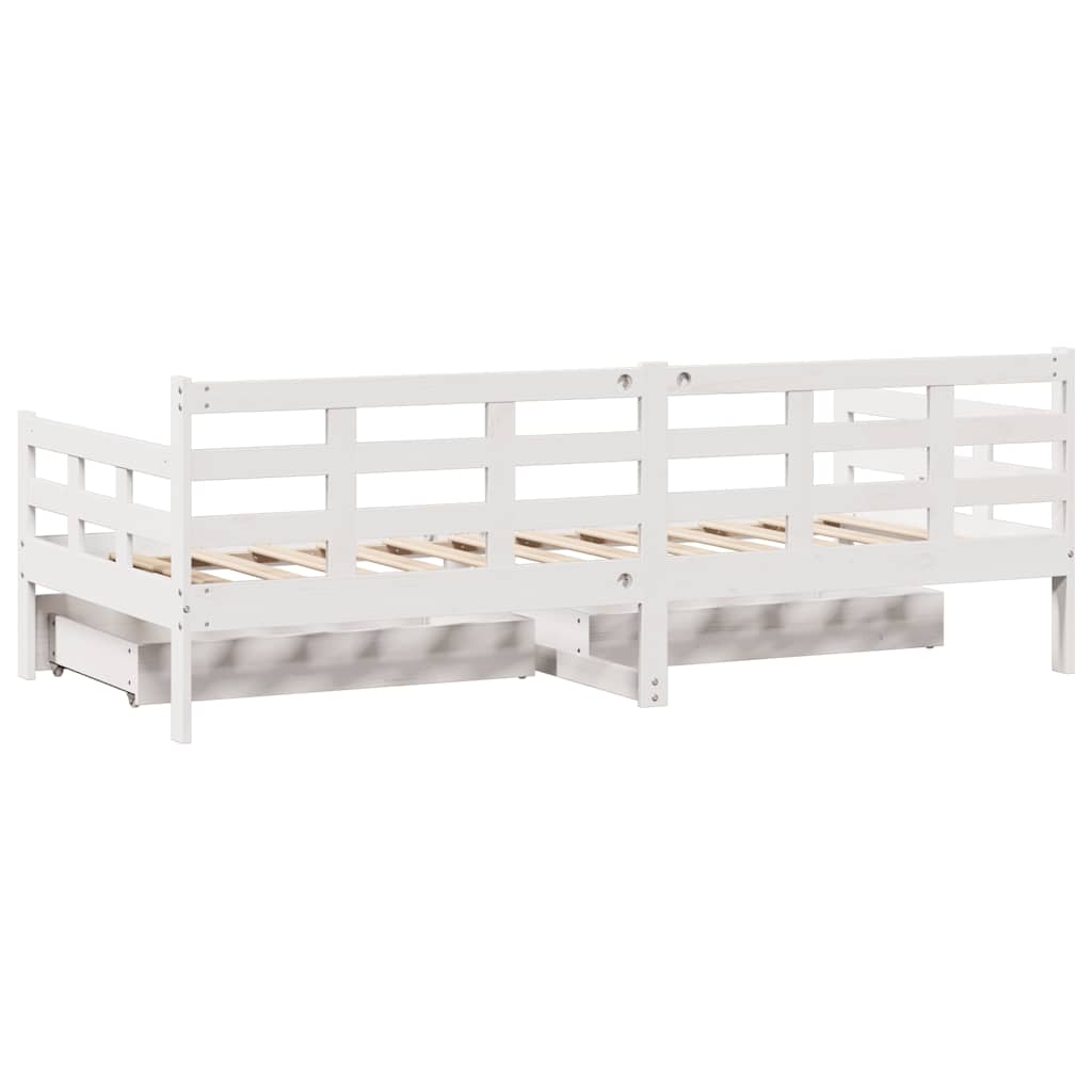 Dieses ausziehbare 2-in-1 Tagesbett mit Schubladen, das sowohl als Sofa als auch als Bett dient, wird ein praktisches und auffälliges Möbel in deinem Wohn- oder Schlafzimmer. Stabiles und langlebiges Gestell: Massives Kiefernholz ist für seine Stärke und Haltbarkeit bekannt. Seine gerade Maserung und die charakteristischen Aststellen tragen zu seinem rustikalen Charme bei.Bettgitter auf 3 Seiten: Mit seinen seitlichen Bettgittern weist dieses Gästebett ein einzigartiges Design auf, das ein Gefühl der Sicherheit vermittelt und deinem Zuhause einen Hauch von raffiniertem Stil verleiht.Latten für optimale Unterstützung: Das Sofabett ist mit Latten ausgestattet, die deine Matratze optimal stützen und auch für Atmungsaktivität sorgen.Rustikaler Charme: Das Schlafsofa verleiht deinem Zuhause einen ländlichen Charme, der sehr entspannend sein kann. Die beruhigende Wirkung dieses hölzernen Schlafsofas verwandelt jedes Schlafzimmer oder Gästezimmer in einen beruhigenden Ort und verleiht dem Raum ein natürliches Element.Reichlich Stauraum: Dieses Gästebett verfügt über zwei Schubladen, die reichlich Stauraum für Kleidung, Socken, Spielzeug, Kissen usw. bieten. Gut zu wissen:Matratzen sind bei diesem Bett nicht im Lieferumfang enthalten. Wir bieten jedoch eine große Auswahl an Matratzen an. Du kannst in unserem Shop nach passenden Matratzen suchen.