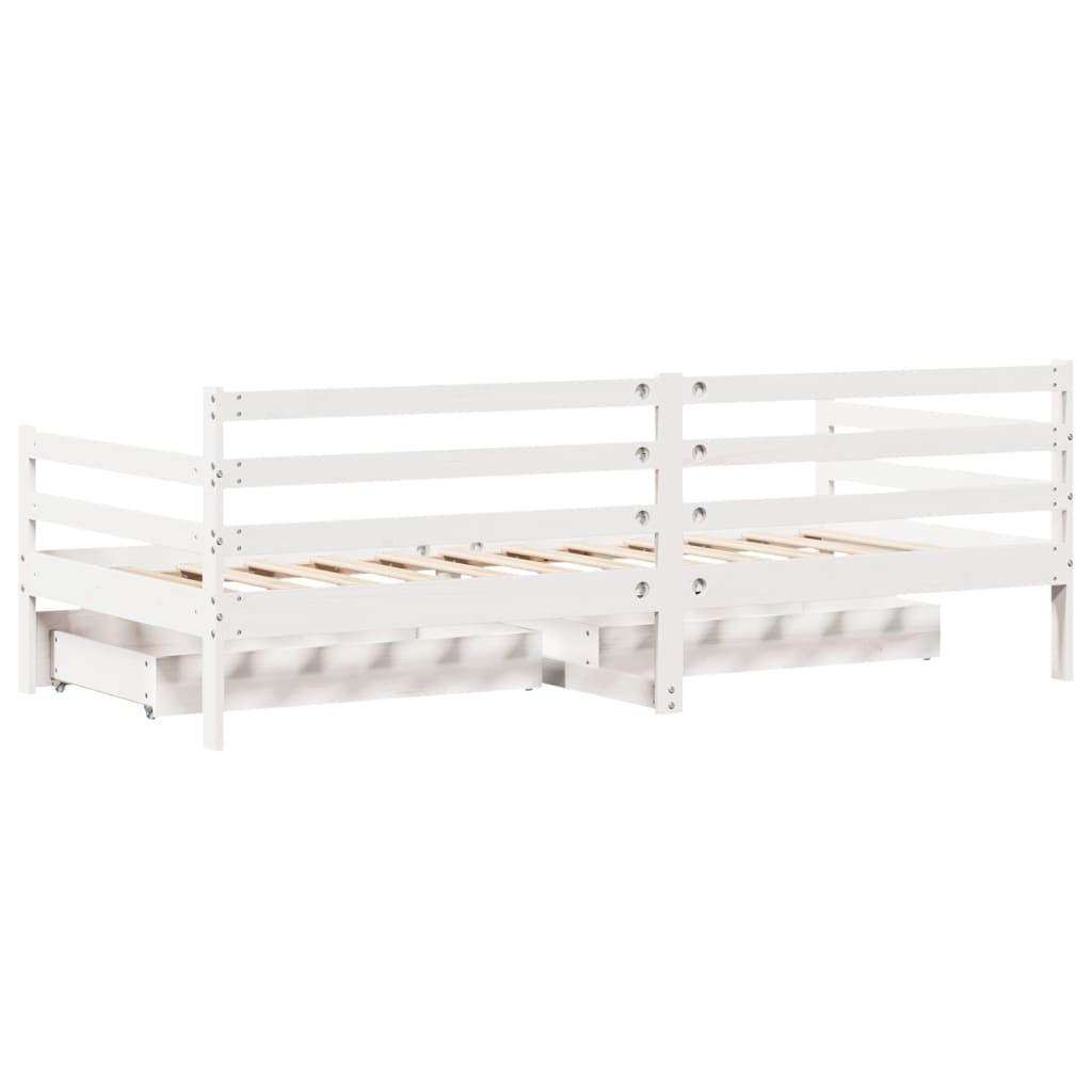 Dieses ausziehbare 2-in-1 Tagesbett mit Schubladen, das sowohl als Sofa als auch als Bett dient, wird ein praktisches und auffälliges Möbel in deinem Wohn- oder Schlafzimmer. Stabiles und langlebiges Gestell: Massives Kiefernholz ist für seine Stärke und Haltbarkeit bekannt. Seine gerade Maserung und die charakteristischen Aststellen tragen zu seinem rustikalen Charme bei.Bettgitter auf 3 Seiten: Mit seinen seitlichen Bettgittern weist dieses Gästebett ein einzigartiges Design auf, das ein Gefühl der Sicherheit vermittelt und deinem Zuhause einen Hauch von raffiniertem Stil verleiht.Latten für optimale Unterstützung: Das Sofabett ist mit Latten ausgestattet, die deine Matratze optimal stützen und auch für Atmungsaktivität sorgen.Rustikaler Charme: Das Schlafsofa verleiht deinem Zuhause einen ländlichen Charme, der sehr entspannend sein kann. Die beruhigende Wirkung dieses hölzernen Schlafsofas verwandelt jedes Schlafzimmer oder Gästezimmer in einen beruhigenden Ort und verleiht dem Raum ein natürliches Element.Reichlich Stauraum: Dieses Gästebett verfügt über zwei Schubladen, die reichlich Stauraum für Kleidung, Socken, Spielzeug, Kissen usw. bieten. Gut zu wissen:Matratzen sind bei diesem Bett nicht im Lieferumfang enthalten. Wir bieten jedoch eine große Auswahl an Matratzen an. Du kannst in unserem Shop nach passenden Matratzen suchen.