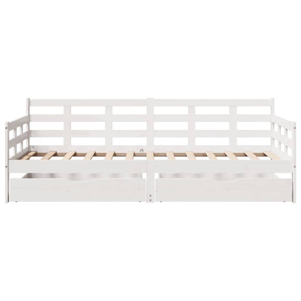 Dieses ausziehbare 2-in-1 Tagesbett mit Schubladen, das sowohl als Sofa als auch als Bett dient, wird ein praktisches und auffälliges Möbel in deinem Wohn- oder Schlafzimmer. Stabiles und langlebiges Gestell: Massives Kiefernholz ist für seine Stärke und Haltbarkeit bekannt. Seine gerade Maserung und die charakteristischen Aststellen tragen zu seinem rustikalen Charme bei.Bettgitter auf 3 Seiten: Mit seinen seitlichen Bettgittern weist dieses Gästebett ein einzigartiges Design auf, das ein Gefühl der Sicherheit vermittelt und deinem Zuhause einen Hauch von raffiniertem Stil verleiht.Latten für optimale Unterstützung: Das Sofabett ist mit Latten ausgestattet, die deine Matratze optimal stützen und auch für Atmungsaktivität sorgen.Rustikaler Charme: Das Schlafsofa verleiht deinem Zuhause einen ländlichen Charme, der sehr entspannend sein kann. Die beruhigende Wirkung dieses hölzernen Schlafsofas verwandelt jedes Schlafzimmer oder Gästezimmer in einen beruhigenden Ort und verleiht dem Raum ein natürliches Element.Reichlich Stauraum: Dieses Gästebett verfügt über zwei Schubladen, die reichlich Stauraum für Kleidung, Socken, Spielzeug, Kissen usw. bieten. Gut zu wissen:Matratzen sind bei diesem Bett nicht im Lieferumfang enthalten. Wir bieten jedoch eine große Auswahl an Matratzen an. Du kannst in unserem Shop nach passenden Matratzen suchen.