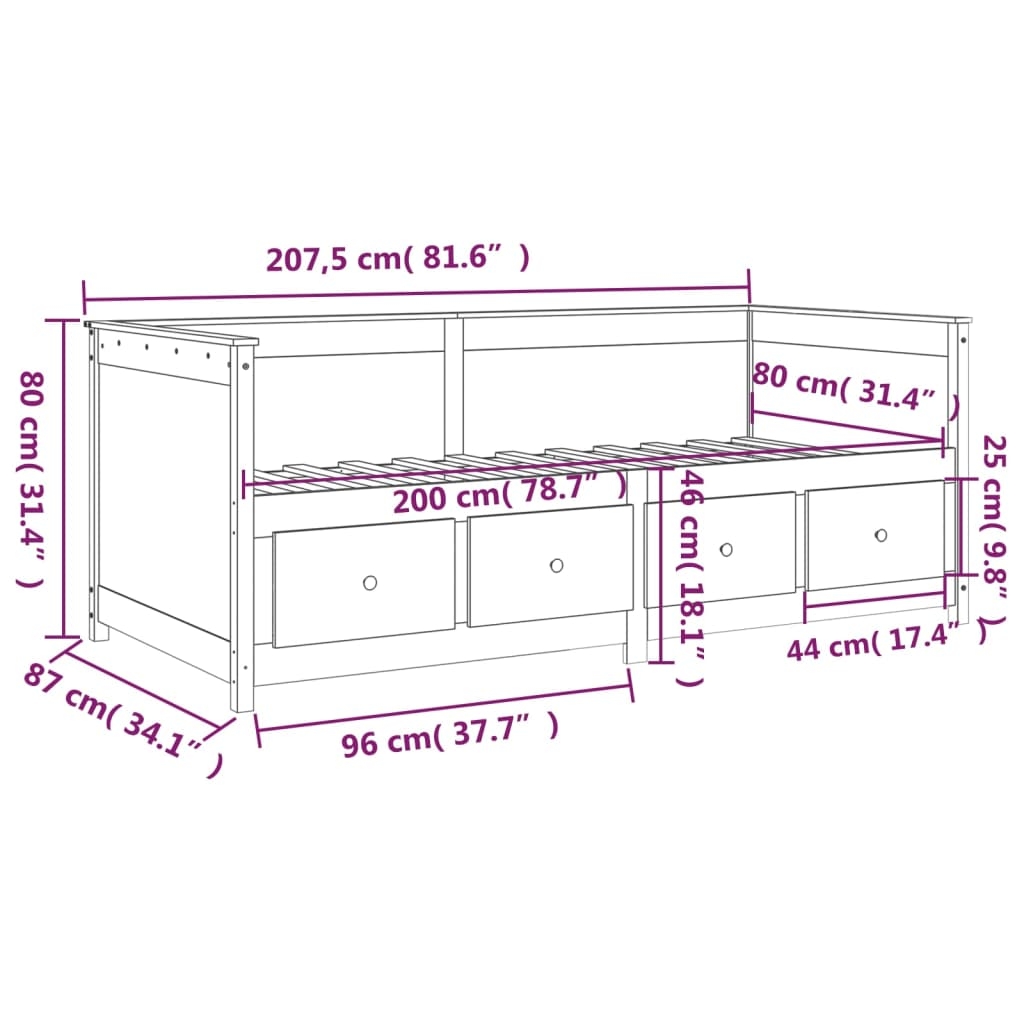 Dieses Tagesbett aus Holz eignet sich perfekt, um unerwarteten Übernachtungsgästen einen gemütlichen Schlafplatz zu bieten, und stellt tagsüber eine bequeme Sitzgelegenheit dar. Massives Kiefernholz: Massives Kiefernholz ist ein wunderschönes Naturmaterial. Kiefernholz weist eine gerade Maserung auf und die Aststellen verleihen dem Material seine charakteristische, rustikale Optik. Multifunktionales Design: Dieses Tagesbett aus Massivholz kann tagsüber als Sofa und nachts als Bett verwendet werden, um Übernachtungsgästen einen gemütlichen Schlafplatz zu bieten.Viel Stauraum: Mit Schubladen versehen, kannst du in diesem Bettkasten bei begrenztem Wohnraum verschiedene Sachen ordentlich aufbewahren und sie gleichzeitig vor Staub schützen. Hinweis:Die Lieferung umfasst nur ein Tagesbett. Die Matratze ist nicht inbegriffen. In unserem Shop findest du auch passende Matratzen.Jedes Produkt wird mit einer Montageanleitung in der Verpackung für eine einfache Montage geliefert.