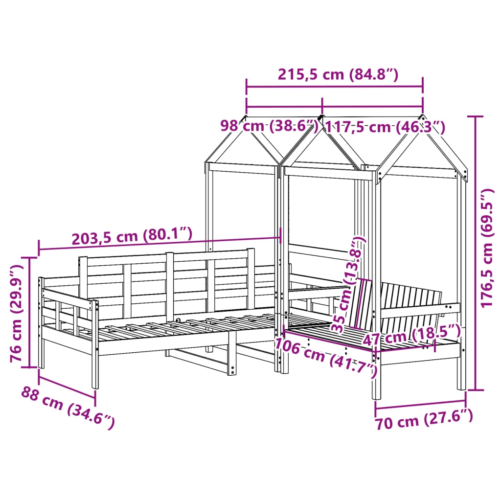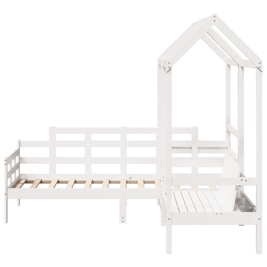 Dieses vielseitige Tagesbett mit Bank kann sowohl als Bett-Set im Schlafzimmer verwendet werden, als auch als Sofa-Set im Wohnzimmer dienen. Es erfüllt die unterschiedlichsten Bedürfnisse und bietet viel Platz zum Schlafen oder Ausruhen. Massives Kiefernholz: Massives Kiefernholz ist ein wunderschönes Naturmaterial. Kiefernholz weist eine gerade Maserung auf und die Aststellen verleihen dem Material seine charakteristische, rustikale Optik.Bettgitter auf 3 Seiten: Mit seinen seitlichen Bettgittern weist dieses Gästebett ein einzigartiges Design auf, das ein Gefühl der Sicherheit vermittelt und deinem Zuhause einen Hauch von raffiniertem Stil verleiht.Latten-Design: Der Lattenrost aus Holz sorgt für eine bessere Luftzirkulation, um die Matratze länger frisch zu halten, verbessert die Gewichtsverteilung und sorgt für Stabilität.Zusätzlicher Stauraum: Nutze den Platz unter dem Bett, um verschiedene Sachen zu verstauen. Perfekt für die Aufbewahrung von Kisten, um deine Kleidung, Spielsachen oder Steppdecken zu organisieren.Praktische Rückenlehne: Die Sitzbank ist mit einer ergonomischen Rückenlehne ausgestattet, um dir vollständige Entspannung zu bieten. Gut zu wissen:Bei diesem Bett ist keine Matratze im Lieferumfang enthalten. Wir bieten jedoch eine große Auswahl an Matratzen an. Du kannst in unserem Shop nach einer passenden Matratze suchen.
