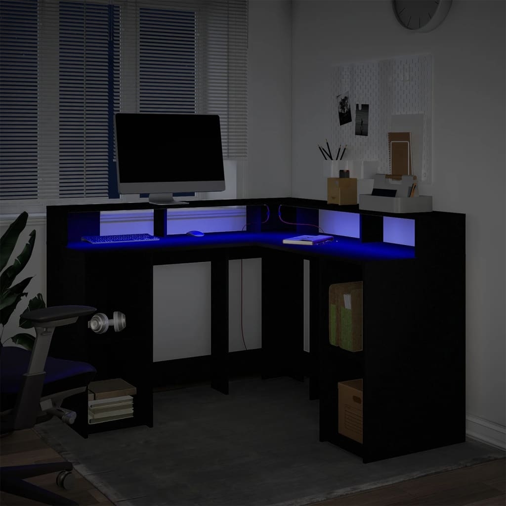 Dieser Schreibtisch schafft reichlich Stauraum, ist robust aufgebaut und mit LED-Beleuchtung versehen, was ihn zur perfekten Wahl macht, um einen übersichtlichen und stilvollen Arbeits- oder Gaming-Bereich zu schaffen. Starkes und langlebiges Material: Holzwerkstoff ist ein langlebiges und robustes Material mit einer glatten Oberfläche, das gegen Feuchtigkeit, Verformung und Rissbildung beständig ist; dadurch ist es eine zuverlässige Wahl für die Herstellung von Möbeln.RGB-LED-Beleuchtung für ein angenehmes Ambiente: Dieser Schreibtisch verfügt über LED-Leuchten, die sich einfach einstellen lassen, um eine personalisierte Lichtshow zu erzeugen. So kannst du die Modi, Farben und Helligkeit anpassen, um das gewünschte Ambiente in deinem Interieur zu schaffen.Reichlich Stauraum: Der Schreibtisch verfügt über offene Fächer und Ablagen und bietet dadurch reichlich Stauraum, um Bürobedarf ordentlich aufzubewahren und für mehr Ordnung auf deinem Schreibtisch zu sorgen.Kompakt und platzsparend: Durch sein Design in L-Form nimmt er kaum Platz in Anspruch und findet den idealen Platz in einer Ecke.Pflegeleicht: Dank seiner glatten Oberfläche lässt sich der LED-Schreibtisch leicht mit einem trockenen und weichen Tuch reinigen und erfordert wenig Pflege. Bitte trenne das Produkt bei Reinigung oder Nichtgebrauch von der Stromversorgung oder unterbreche die Stromversorgung. Achtung:Um ein Umkippen zu vermeiden, sollte dieses Produkt mit der mitgelieferten Wandhalterung gesichert werden. Gut zu wissen:Schrauben und Dübel sind für die Befestigung an der Wand nicht im Lieferumfang enthalten. Wir empfehlen dir, speziell für deine Wände geeignete Schrauben und Dübel zu finden und zu verwenden. Im Zweifelsfall wende dich an einen Fachmann. Bitte lese und befolge jeden Schritt der Anweisungen.Das Produkt verfügt über einen USB-Anschluss, für den eine zertifizierte 5V-USB-Stromquelle erforderlich ist (nicht im Lieferumfang enthalten).
