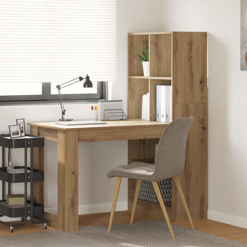 Dieser Schreibtisch ist ein praktisches und kompaktes Möbelstück, perfekt für dein Home-Office oder Arbeitszimmer. Er trifft den modernen Stil mit seiner einfachen und eleganten Ausstrahlung und passt super zu den heutigen Trends. Mit 122 x 67 x 145 cm fügt sich dieser Schreibtisch problemlos in viele Räume ein. Seine schlanke Oberfläche bietet dir einen bequemen Schreibbereich, und der Holzwerkstoff sorgt dafür, dass er für deine täglichen Aktivitäten langlebig ist. Mit viel Stauraum für all deine Sachen ist er ideal für Profis, Studenten oder einfach für alle, die kreativ sein wollen. Holzwerkstoff-Konstruktion Vollständig aus Holzwerkstoff gefertigt, bietet dieser Schreibtisch soliden Halt und eine schön glatte Schreibfläche. Die gleichmäßige Textur verbessert sowohl die Funktion als auch das Aussehen und macht ihn zu einem zuverlässigen Ort für Arbeit oder Kreativität. Umfassende Stauraumlösungen Mit seinen Regalen hat dieser Schreibtisch viele Stauraumoptionen. Diese Regale aus Holzwerkstoffen bieten ein stabiles Rahmenwerk, um Vorräte, Dokumente oder Bücher ordentlich zu halten und verbessern sowohl die Funktion als auch das Aussehen in jedem Arbeitsplatz. Ideale Abmessungen Mit den Maßen 122 x 67 x 145 cm passt dieser Schreibtisch leicht in jedes Büro oder Arbeitszimmer. Die clevere Größe eignet sich für Computerarbeit, Papierkram oder kreative Aufgaben und bietet viel Beinfreiheit und einen einladenden Arbeitsbereich, der Fokus und Produktivität fördert. Minimalistisches Design Im Einklang mit modernen Trends hat der Schreibtisch klare Linien und einen freistehenden Stil, der es dir ermöglicht, ihn flexibel in jedem Raum zu platzieren. Seine einfache Silhouette passt sowohl zu modernem als auch zu traditionellem Dekor, was ihn vielseitig für verschiedene Einrichtungsstile macht. Einfacher Aufbau Eine mühelose Montage ist dank klarer, Schritt-für-Schritt-Anleitungen im Paket gewährleistet. Du brauchst nur einen Schraubendreher, sodass es für jeden einfach ist. Außerdem kommt er mit einer Wandhalterung, um ein Umkippen zu verhindern, was ihn sicher und stabil macht.