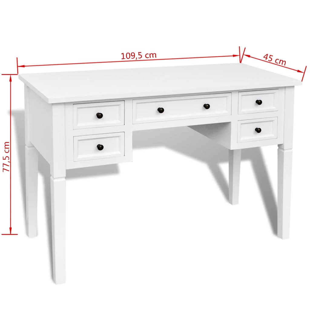 Dieser klassische Schreibtisch, mit seinem einfachen, jedoch zeitlosen Design, wird Ihrem Studienraum oder Schlafzimmer eine romantische Note verleihen. Dieser haltbare Tisch verfügt über fünf große Schubfächer, die ausreichend Platz für die Aufbewahrung und Organisierung Ihrer Akten, Papiere, Unterlagen und anderer Büromaterialien bieten. Außerdem bietet die Schreibtischplatte einen großzügigen Raum für die Abstellung Ihres Schmucks oder anderer persönlichen Sachen. Dieser robuste Schreibtisch ist aus hochwertigem MDF und Kiefernholz gefertigt und ist weiß lackiert.