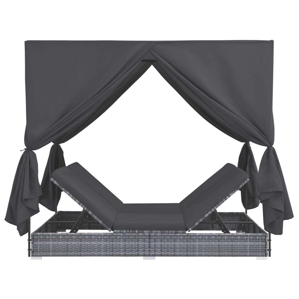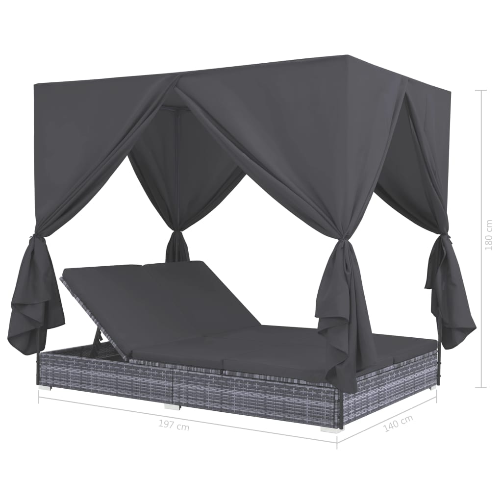 Diese hochwertige Poly-Rattan-Sonnenliege ist eine perfekte Kombination aus Stil und Funktionalität. Das Outdoor-Tagesbett besteht aus wetterbeständigem PE-Rattan, das leicht zu reinigen ist. Dank des pulverbeschichteten Stahlrahmens und der dicken weichen Kissen ist die Liege sehr stabil und bequem. Die Kissenbezüge mit Reißverschlüssen sind abnehmbar und waschbar. Diese Doppel-Chaiselongue kann in 7 verschiedenen Positionen von beiden Seiten verstellt werden, um zusätzlichen Sitz- und Liegekomfort zu bieten. Die Vorhänge, die über dem Rahmen hängen, wirken nicht nur luxuriös aus, sondern halten auch Insekten fern und sorgen für Schatten und Privatsphäre. Die Vorhänge können abgenommen und gelagert werden, wenn Sie die Sonne frei genießen wollen. Die Sonnenliege ist einfach zu montieren. Lieferung beinhaltet 1 Sonnenliege für 2 Personen, 2 große Kissen und die dazugehörigen Vorhänge. Hinweis: Wir empfehlen, das Set bei Regen, Schnee und Frost abzudecken.