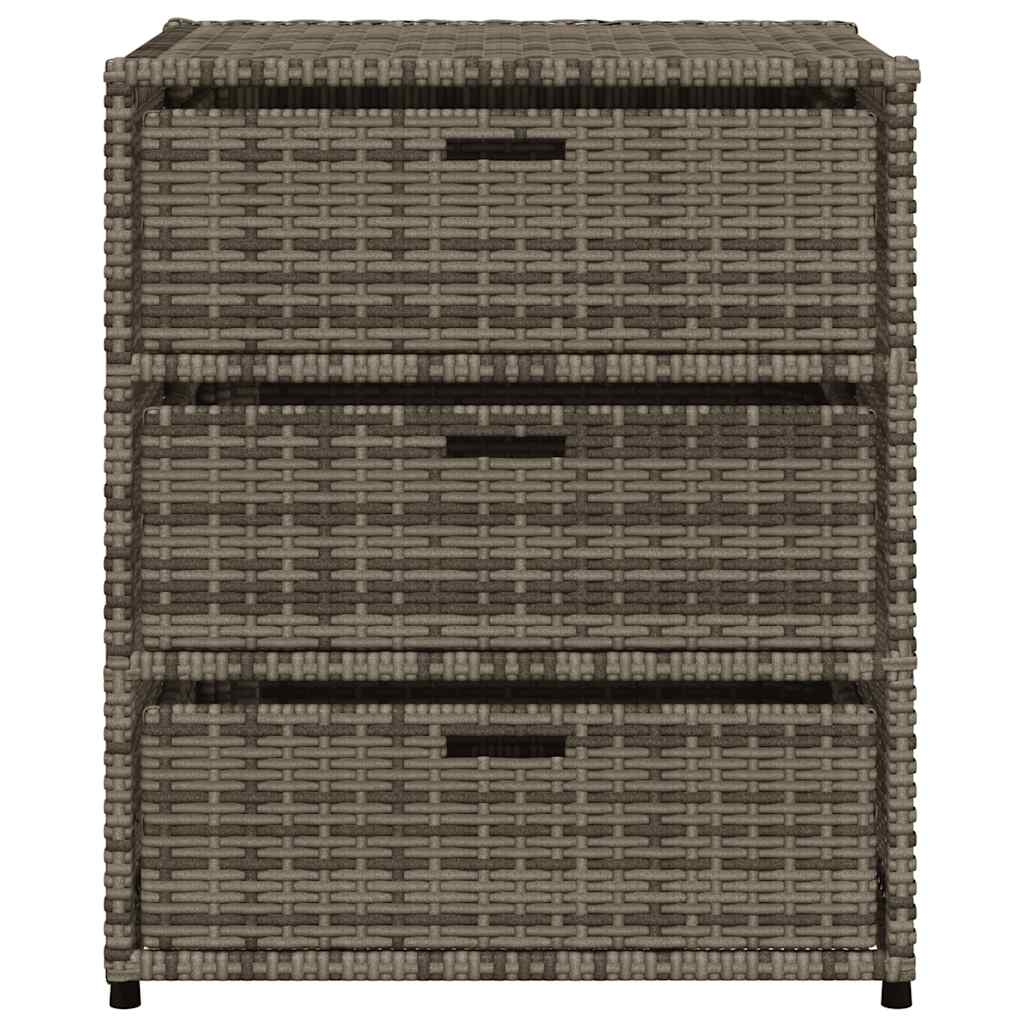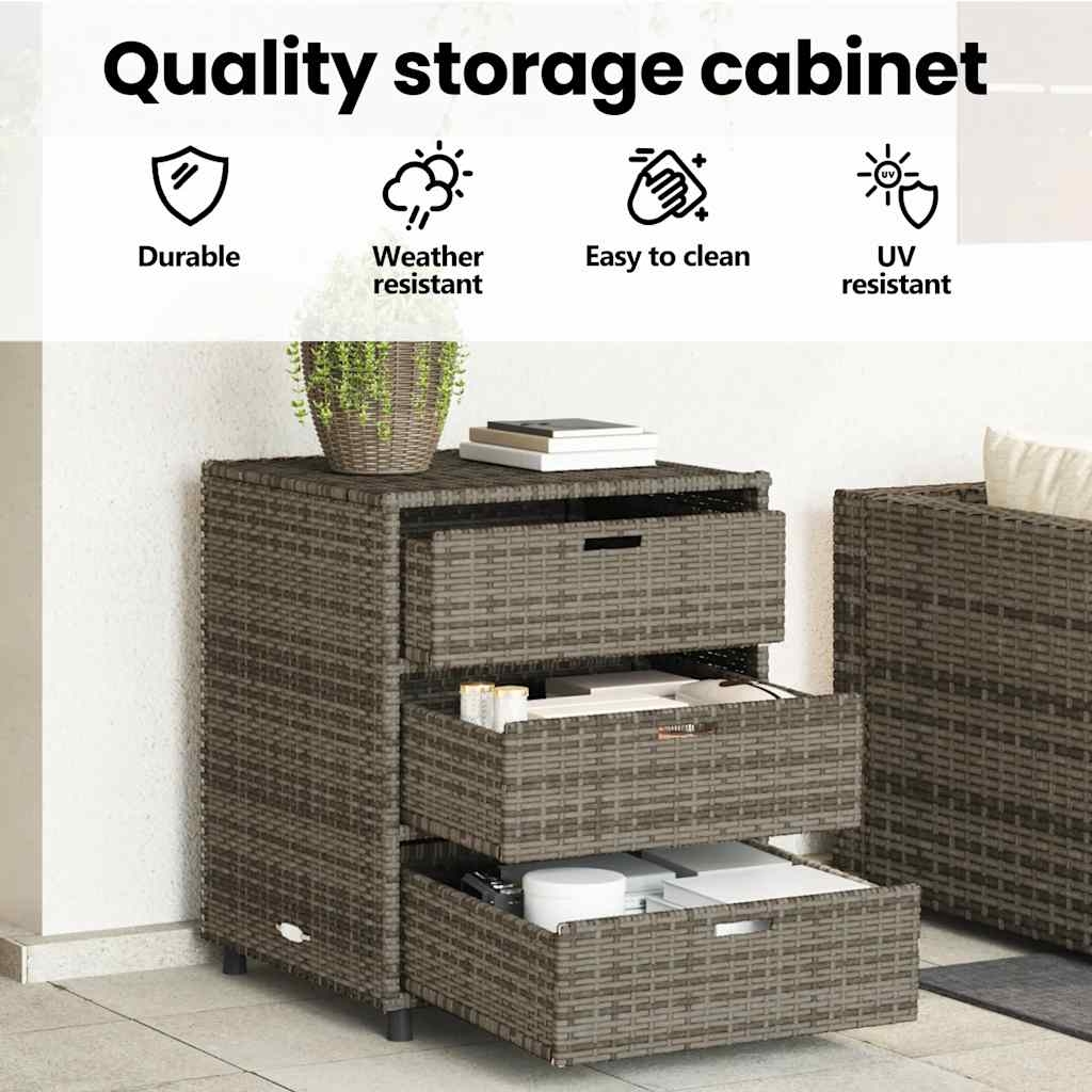 Dieser Outdoor-Schrank eignet sich perfekt, um deine Decken, Kissen, Gartenbedarf, Pooltücher und andere Gegenstände ordentlich und leicht zugänglich aufzubewahren. Langlebiges Material: PE-Rattan, auch als Poly Rattan bekannt, ist ein robustes, pflegeleichtes synthetisches Material, das die Optik von natürlichem Rattan aufweist. Es kennzeichnet sich durch ein geringes Eigengewicht und lässt sich einfach reinigen. Aufgrund seiner Haltbarkeit und Witterungsbeständigkeit wird es häufig bei der Herstellung von Gartenmöbeln verwendet.Viel Stauraum: Dieser Outdoor-Aufbewahrungsschrank verfügt über 3 Schubladen zur Aufbewahrung deiner Gartengeräte, Poolspielzeuge, Outdoor-Kissen und mehr.Robuster und stabiler Rahmen: Dank des pulverbeschichteten Stahlrahmens ist das Outdoor-Möbel robust, stabil und für den täglichen Einsatz im Außenbereich geeignet. AchtungUm ein Umkippen zu vermeiden, sollte dieses Produkt mit der mitgelieferten Wandhalterung gesichert werden. Gut zu wissen:Wir empfehlen dir, deine Gartenmöbel mit einer wasserdichten Hülle zu schützen, um lange Zeit eine ansprechende Optik aufzuweisen.