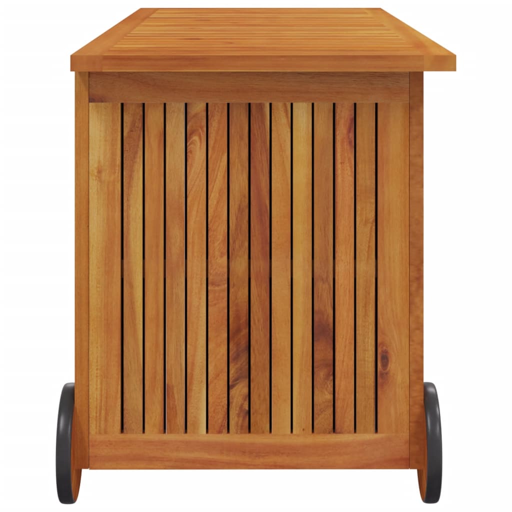 Diese Gartenbox aus Holz bietet reichlich Stauraum für Möbelkissen, Auflagen, Decken und alle anderen Sachen, die du im Außenbereich gerne griffbereit haben möchtest. Die Aufbewahrungsbox ist auch für die Verwendung im Innenbereich geeignet. Langlebiges Material: Massives Akazienholz ist ein schönes Naturmaterial. Akazienholz ist ein tropisches Hartholz, das dicht, robust und langlebig ist.Viel Stauraum: In dieser Truhe kannst du deine Sachen ganz ordentlich aufbewahren. Sie schafft Stauraum für Kissen, Auflagen, Decken, Spielzeug und andere Gegenstände.Praktisches Design: Der wasserabweisende Innenbeutel schützt deine Sachen vor Feuchtigkeit und Staub. Dank der Rollen und des Handgriffs lässt sich die Kissenbox auch einfach umher verschieben. Hinweis:Um die Lebensdauer deiner Gartenmöbel zu verlängern, empfehlen wir dir, sie mit einer wasserdichten Hülle zu schützen.Jedes Produkt wird mit einer Montageanleitung in der Verpackung für einen einfachen Zusammenbau geliefert.