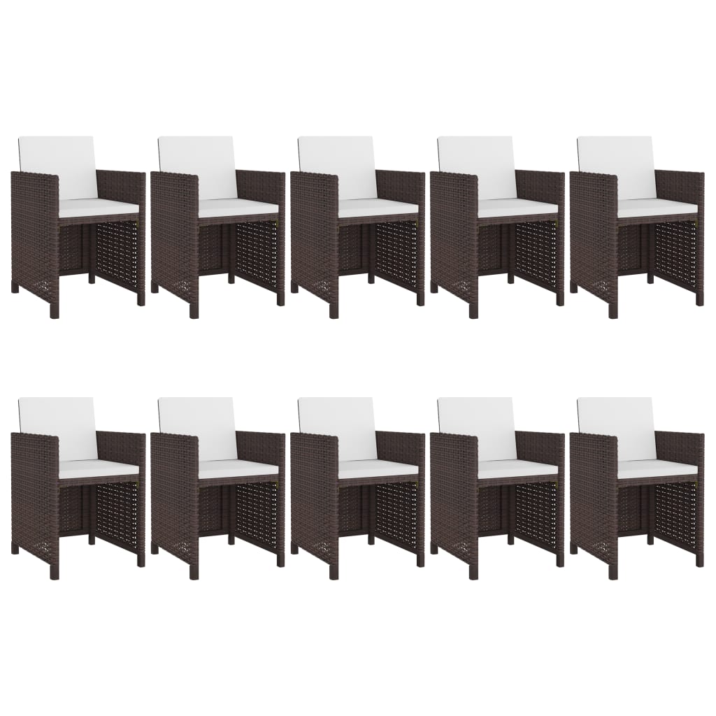 Diese stilvolle Rattan-Essgruppe wird der Hingucker in Ihrem Garten oder auf Ihrer Terrasse sein! Diese Rattan-Essgruppe im eleganten, modernen Design ist eine sehr gute Wahl für Ihre Mahlzeiten im Freien oder einfach zum Entspannen im Garten. Aus wetterbeständigem und wasserdichtem PE-Rattan gefertigt, ist die Essgruppe leicht zu reinigen, strapazierfähig und für den täglichen Gebrauch bestens geeignet. Die pulverbeschichteten Stahlrahmen machen den Tisch und die Stühle stark und robust. Durch ihr leichtes Design sind alle Teile einfach zu bewegen. Die Glastischplatte kann mühelos mit einem feuchten Tuch gereinigt werden. Die dicken, weichen, mit Schaumstoff gefüllten Sitz- und Rückenkissen sind äußerst komfortabel und aus wasserabweisendem Polyester gefertigt. Die Kissenbezüge mit Reißverschlüssen können leicht entfernt und gewaschen werden. Im Lieferumfang enthalten sind 1 Tisch, 10 Stühle und 20 Kissen. Hinweis: Wir empfehlen das Set bei Regen, Schnee und Frost abzudecken.