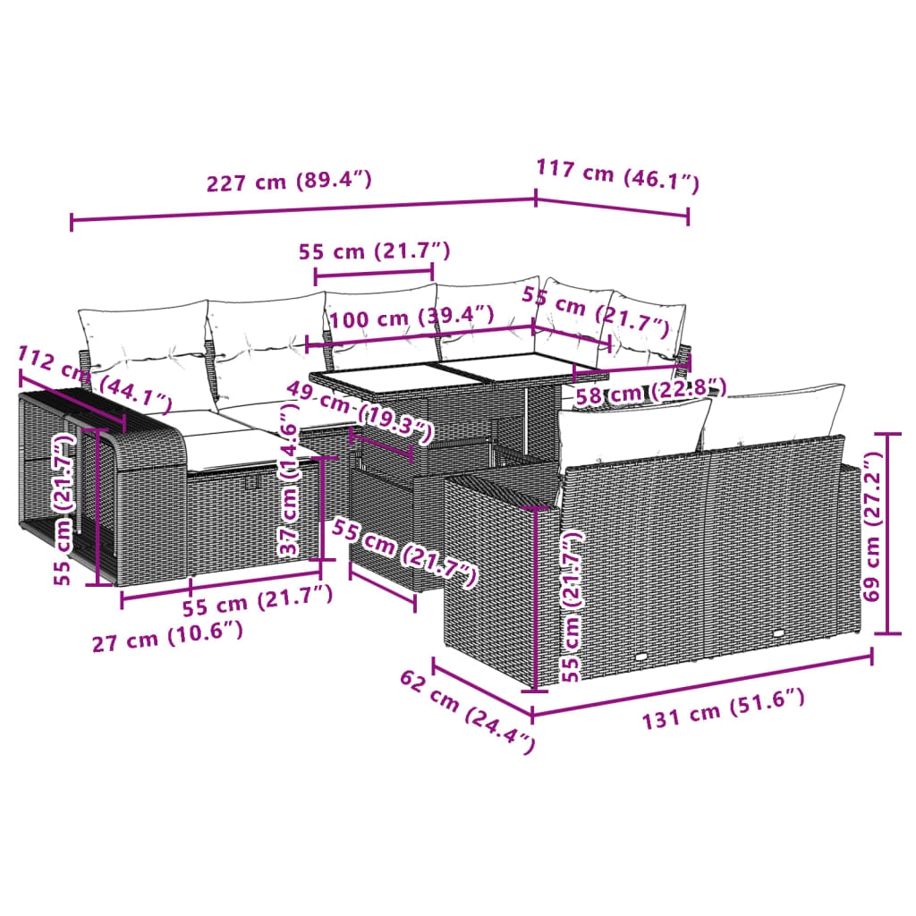 Diese Garten-Sofagarnitur ist die perfekte Ergänzung zu deinem Garten, deiner Terrasse oder deinem Innenhof. Sie bietet einen bequemen und einladenden Platz, um mit Familie und Freunden zu plaudern oder dich einfach nur zu entspannen und das Leben im Freien zu genießen. Langlebiges Material: PE-Rattan, auch als Poly Rattan bekannt, ist ein robustes, pflegeleichtes synthetisches Material, das die Optik von natürlichem Rattan aufweist. Es kennzeichnet sich durch ein geringes Eigengewicht und lässt sich einfach reinigen. Aufgrund seiner Haltbarkeit und Witterungsbeständigkeit wird es häufig bei der Herstellung von Gartenmöbeln verwendet. Bequemes Sitzerlebnis: Dieser Gartensessel mit dick gepolsterten Kissen bietet ein angenehmes Sitzgefühl. Verstellbare Tischplatte: Die Tischplatte lässt sich anheben, um den Gartentisch höher zu machen und ihn von einem Couchtisch in einen Esstisch zu verwandeln. Er eignet sich daher perfekt für Gäste oder Mahlzeiten im Freien. Vielseitiger Fußhocker: Der Hocker ist vielseitig einsetzbar und dient als bequeme Fußstütze beim Entspannen auf dem Sofa oder als zusätzlicher Sitzplatz in deinem Garten. Modulares Design: Dank des modularen Designs lassen sich die Gartenmöbel völlig flexibel und einfach umstellen, um deinen Außenbereich ganz individuell zu gestalten. Gut zu wissen:Wir empfehlen dir, deine Gartenmöbel mit einer wasserdichten Hülle zu schützen, um lange Zeit eine ansprechende Optik aufzuweisen.