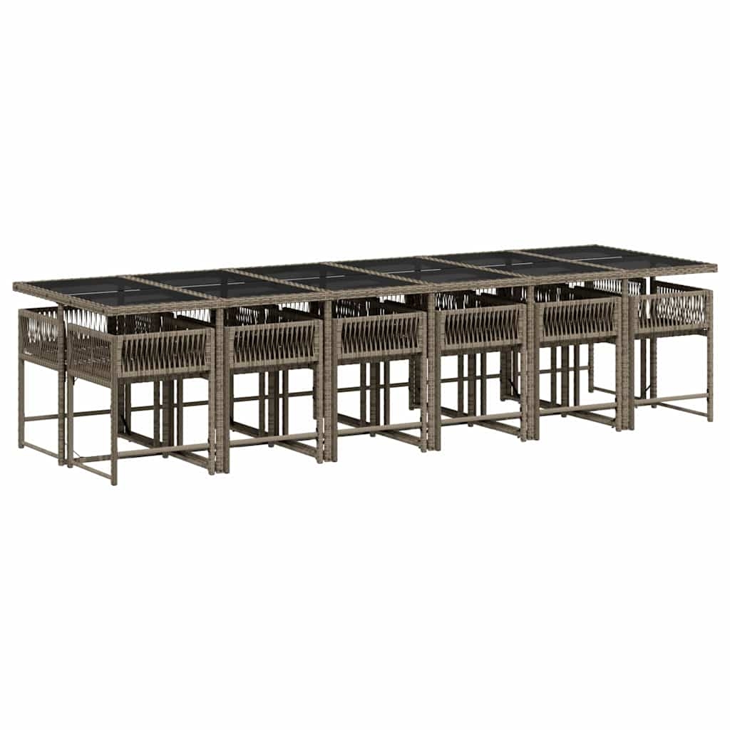 Diese Garten-Essgruppe ist eine ideale Wahl für Mahlzeiten im Freien oder einfach nur zum Entspannen im Garten, Hinterhof oder auf der Terrasse. Langlebiges Material: PE-Rattan, auch als Poly Rattan bekannt, ist ein robustes, pflegeleichtes synthetisches Material, das die Optik von natürlichem Rattan aufweist. Es kennzeichnet sich durch ein geringes Eigengewicht und lässt sich einfach reinigen. Aufgrund seiner Haltbarkeit und Witterungsbeständigkeit wird es häufig bei der Herstellung von Gartenmöbeln verwendet.Platzsparende Aufbewahrung: Dank der klappbaren Rückenlehnen lassen sich die Stühle unter dem Tisch verstauen, sodass die gesamte Essgruppe bei Nichtgebrauch eine platzsparende Würfelform bildet.Bequemes Sitzerlebnis: Dieser Gartensessel mit dick gepolsterten Kissen bietet ein angenehmes Sitzgefühl.Abnehmbarer und waschbarer Bezug: Die Sitzkissen verfügen über abnehmbare Bezüge, die sich ganz einfach waschen und reinigen lassen. Dank der Klappen an der Rückseite können die Kissen ganz einfach an den Rückenlehnen befestigt werden.Tischplatte aus Glas: Die Tischplatte des Gartentisches besteht aus starkem und langlebigem Hartglas, sodass sie leicht mit einem feuchten Tuch gereinigt werden kann und deinem Außenbereich einen Hauch von Eleganz verleiht. Gut zu wissen:Wir empfehlen dir, deine Gartenmöbel mit einer wasserdichten Hülle zu schützen, um lange Zeit eine ansprechende Optik aufzuweisen.