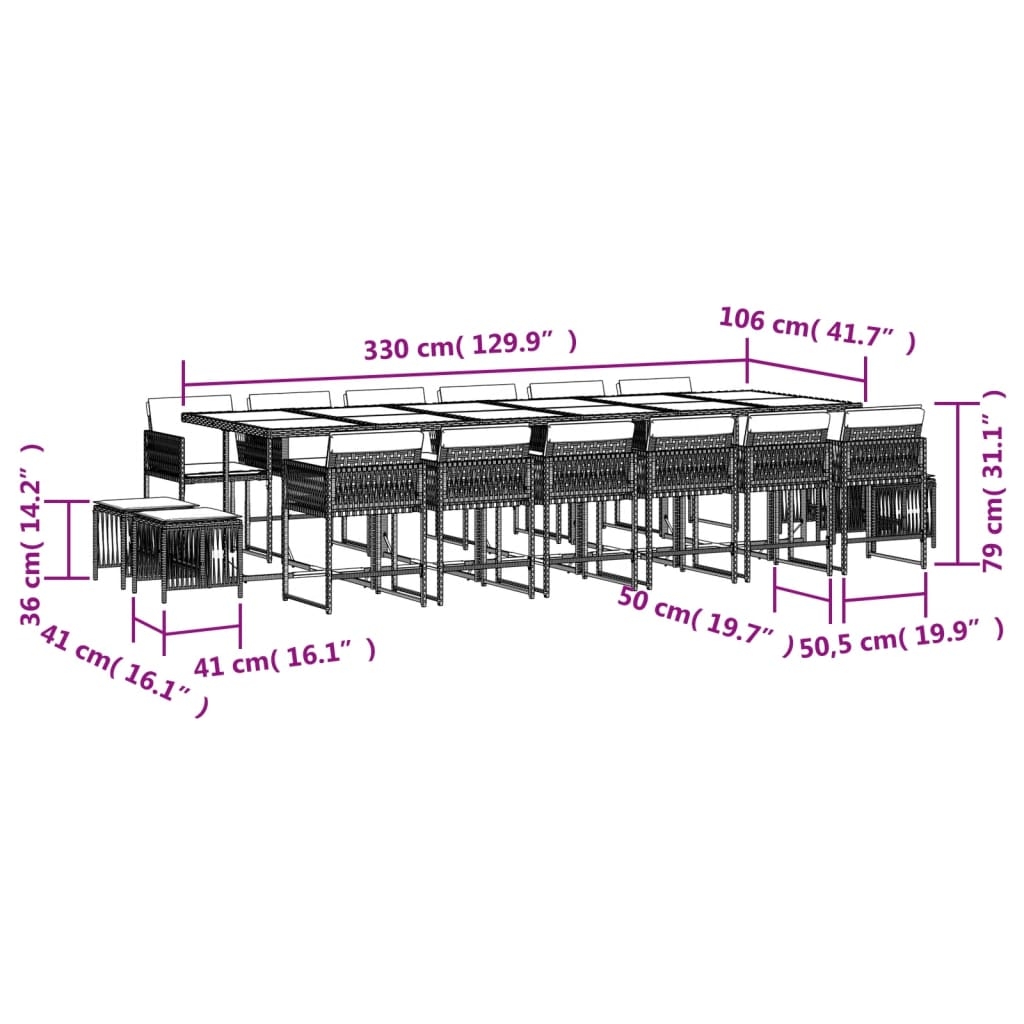 Diese Garten-Essgruppe ist eine ideale Wahl für Mahlzeiten im Freien oder einfach nur zum Entspannen im Garten, Hinterhof oder auf der Terrasse. Langlebiges Material: PE-Rattan, auch als Poly Rattan bekannt, ist ein robustes, pflegeleichtes synthetisches Material, das die Optik von natürlichem Rattan aufweist. Es kennzeichnet sich durch ein geringes Eigengewicht und lässt sich einfach reinigen. Aufgrund seiner Haltbarkeit und Witterungsbeständigkeit wird es häufig bei der Herstellung von Gartenmöbeln verwendet.Platzsparende Aufbewahrung: Dank der klappbaren Rückenlehne lassen sich die Stühle unter dem Tisch verstauen. Zudem finden auch die Hocker Platz unter den Stühlen, sodass die gesamte Essgruppe bei Nichtgebrauch eine platzsparende Würfelform bildet, um deinen verfügbaren Platz optimal auszunutzen.Bequemes Sitzerlebnis: Dieser Gartensessel mit dick gepolsterten Kissen bietet ein angenehmes Sitzgefühl.Abnehmbarer und waschbarer Bezug: Die Sitzkissen verfügen über abnehmbare Bezüge, die sich ganz einfach waschen und reinigen lassen. Dank der Klappen an der Rückseite können die Kissen ganz einfach an den Rückenlehnen befestigt werden.Tischplatte aus Glas: Die Tischplatte des Gartentisches besteht aus starkem und langlebigem Hartglas, sodass sie leicht mit einem feuchten Tuch gereinigt werden kann und deinem Außenbereich einen Hauch von Eleganz verleiht. Gut zu wissen:Wir empfehlen dir, deine Gartenmöbel mit einer wasserdichten Hülle zu schützen, um lange Zeit eine ansprechende Optik aufzuweisen.