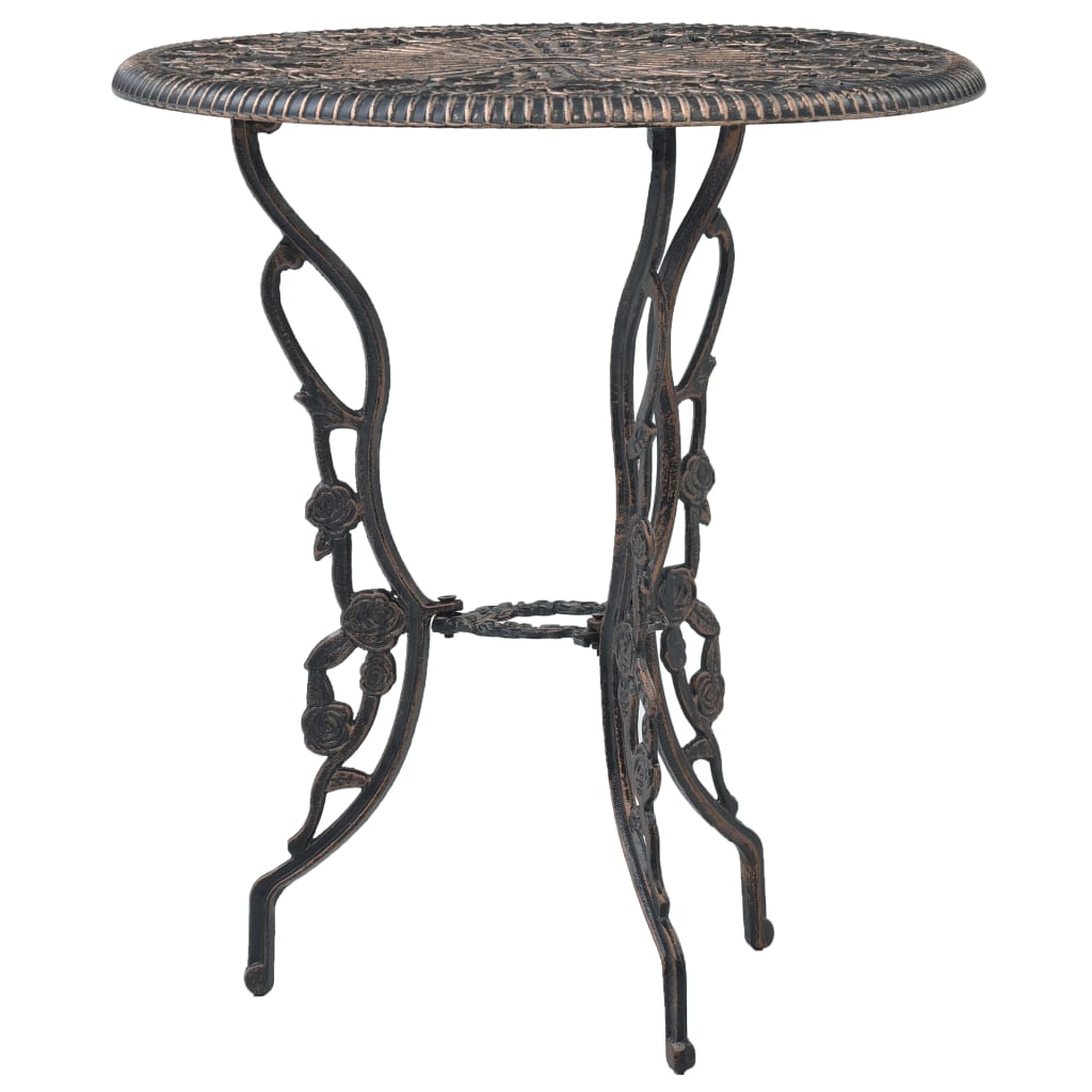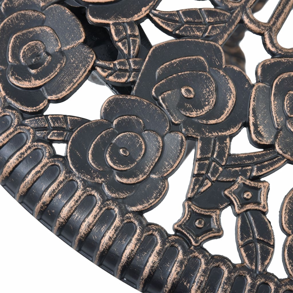 Dieses Bistro-Set aus Aluminiumguss hat ein elegantes Design und besteht aus 1 Tisch und 2 Stühlen. Es ist eine großartige Wahl für Mahlzeiten auf Ihrer Terrasse, dem Balkon oder im Garten, kann aber auch gewerblich in Bars und Restaurants verwendet werden. Der Gartentisch und die Stühle bestehen aus strapazierfähigem Aluminiumguss, der wetterbeständig und äußerst langlebig ist. Die gusseisernen Beine tragen zur Robustheit des Sets bei. Das detaillierte Blumenmuster verleiht jedem Garten, jeder Terrasse oder jedem Wintergarten eine romantische Note. Die Lieferung enthält 1 Tisch und 2 Stühle.