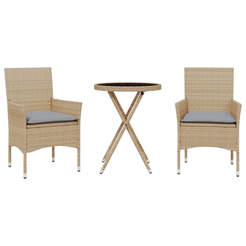 Genieße eine Tasse Kaffee oder unterhalte dich mit deiner Familie und deinen Freunden im Garten, Hinterhof oder auf dem Balkon mit diesem bequemen Bistro-Set! Langlebiges Material: PE-Rattan, auch als Poly Rattan bekannt, ist ein robustes, pflegeleichtes synthetisches Material, das die Optik von natürlichem Rattan aufweist. Es kennzeichnet sich durch ein geringes Eigengewicht und lässt sich einfach reinigen. Aufgrund seiner Haltbarkeit und Witterungsbeständigkeit wird es häufig bei der Herstellung von Gartenmöbeln verwendet.Bequemes Sitzerlebnis: Dieses Gartenmöbel-Set wird samt dick gepolsterten Kissen geliefert, um höchsten Sitzkomfort zu bieten.Abnehmbarer und waschbarer Bezug: Diese Sitzkissen verfügen über abnehmbare Bezüge für einfaches Waschen und Pflegen.Tischplatte aus Glas: Die Tischplatte des Gartentisches besteht aus starkem und langlebigem Hartglas, sodass sie leicht mit einem feuchten Tuch gereinigt werden kann und deinem Außenbereich einen Hauch von Eleganz verleiht. Gut zu wissen:Wir empfehlen dir, deine Gartenmöbel mit einer wasserdichten Hülle zu schützen, um lange Zeit eine ansprechende Optik aufzuweisen.