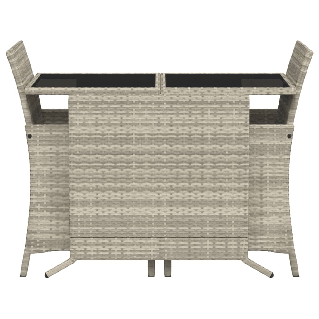 Genieße eine Tasse Kaffee oder unterhalte dich mit deiner Familie und deinen Freunden im Garten, Hinterhof oder auf dem Balkon mit diesem bequemen Bistro-Set! Langlebiges Material: PE-Rattan, auch als Poly Rattan bekannt, ist ein robustes, pflegeleichtes synthetisches Material, das die Optik von natürlichem Rattan aufweist. Es kennzeichnet sich durch ein geringes Eigengewicht und lässt sich einfach reinigen. Aufgrund seiner Haltbarkeit und Witterungsbeständigkeit wird es häufig bei der Herstellung von Gartenmöbeln verwendet.Bequemes Sitzerlebnis: Dieser Gartensessel mit dick gepolsterten Kissen bietet ein angenehmes Sitzgefühl.Abnehmbarer und waschbarer Bezug: Diese Sitzkissen verfügen über abnehmbare Bezüge für einfaches Waschen und Pflegen.Kompakte Aufbewahrung: Die Gartenstühle können platzsparend unter dem Tisch verstaut werden.Tischplatte aus Glas: Die Tischplatte des Gartentisches besteht aus starkem und langlebigem Hartglas, sodass sie leicht mit einem feuchten Tuch gereinigt werden kann und deinem Außenbereich einen Hauch von Eleganz verleiht. Gut zu wissen:Wir empfehlen dir, deine Gartenmöbel mit einer wasserdichten Hülle zu schützen, um lange Zeit eine ansprechende Optik aufzuweisen.