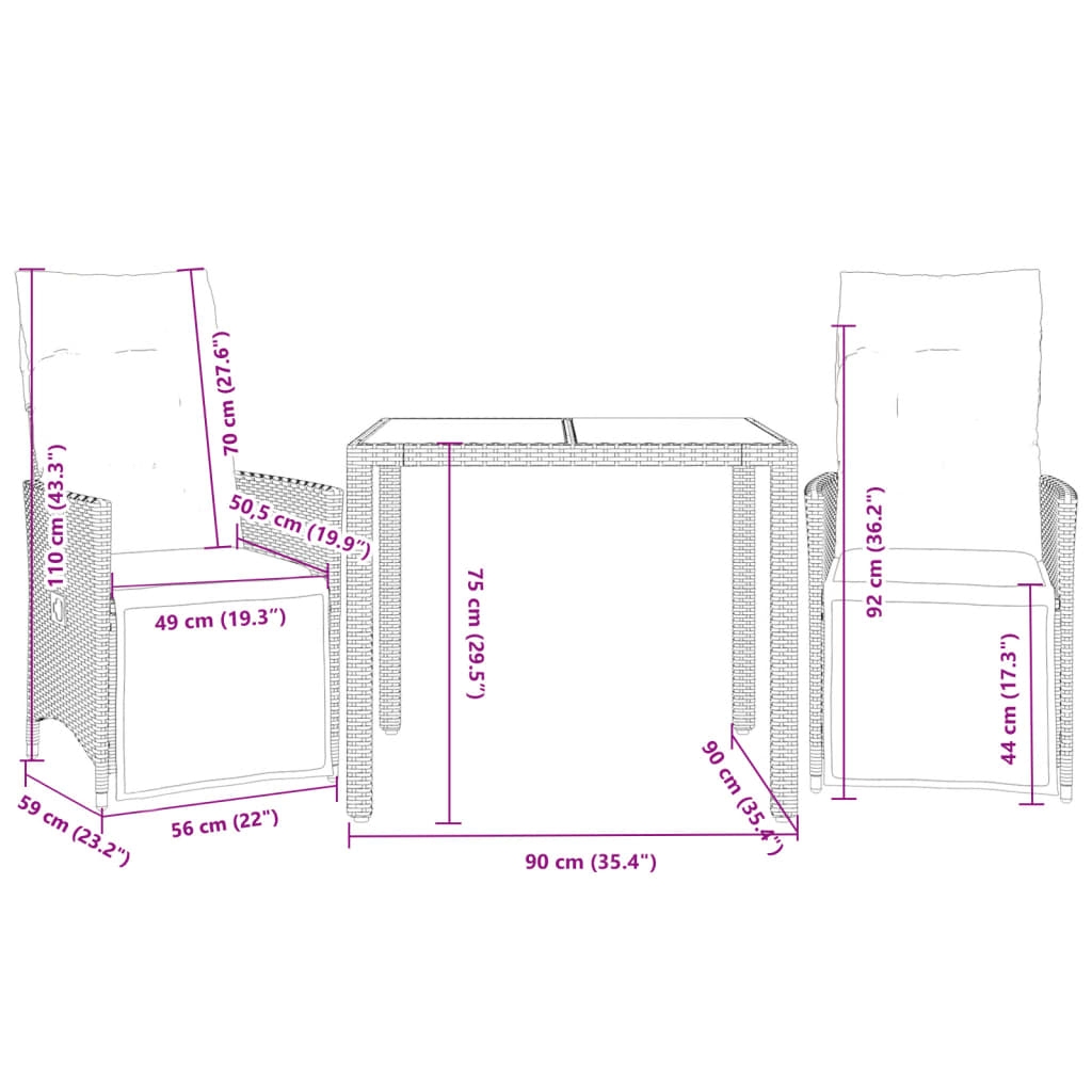 Genieße einen Kaffee oder unterhalte dich mit deiner Familie und deinen Freunden im Garten, Hinterhof oder auf dem Balkon mit diesem bequemen Bistro-Set! Langlebiges Material: PE-Rattan, auch als Poly Rattan bekannt, ist ein robustes, pflegeleichtes synthetisches Material, das die Optik von natürlichem Rattan aufweist. Es kennzeichnet sich durch ein geringes Eigengewicht und lässt sich einfach reinigen. Aufgrund seiner Haltbarkeit und Witterungsbeständigkeit wird es häufig bei der Herstellung von Gartenmöbeln verwendet.Verstellbare Rückenlehne und verstellbares Fußteil: Der Gartensessel ist mit einem Griff versehen. So kannst du die Rückenlehne und das Fußteil durch Ziehen des Griffs verstellen und sie danach schnell wieder in ihre ursprüngliche Position bringen.Bequemes Sitzerlebnis: Dieser Gartensessel mit dick gepolsterten Kissen bietet ein angenehmes Sitzgefühl.Abnehmbarer und waschbarer Bezug: Die Sitzkissen verfügen über abnehmbare Bezüge, die sich ganz einfach waschen und reinigen lassen. Dank der Klappen an der Rückseite können die Rückenkissen ganz einfach an den Rückenlehnen befestigt werden.Tischplatte aus Glas: Die Tischplatte des Gartentisches besteht aus starkem und langlebigem Hartglas, sodass sie leicht mit einem feuchten Tuch gereinigt werden kann und deinem Außenbereich einen Hauch von Eleganz verleiht. Gut zu wissen:Wir empfehlen dir, deine Gartenmöbel mit einer wasserdichten Hülle zu schützen, um lange Zeit eine ansprechende Optik aufzuweisen.
