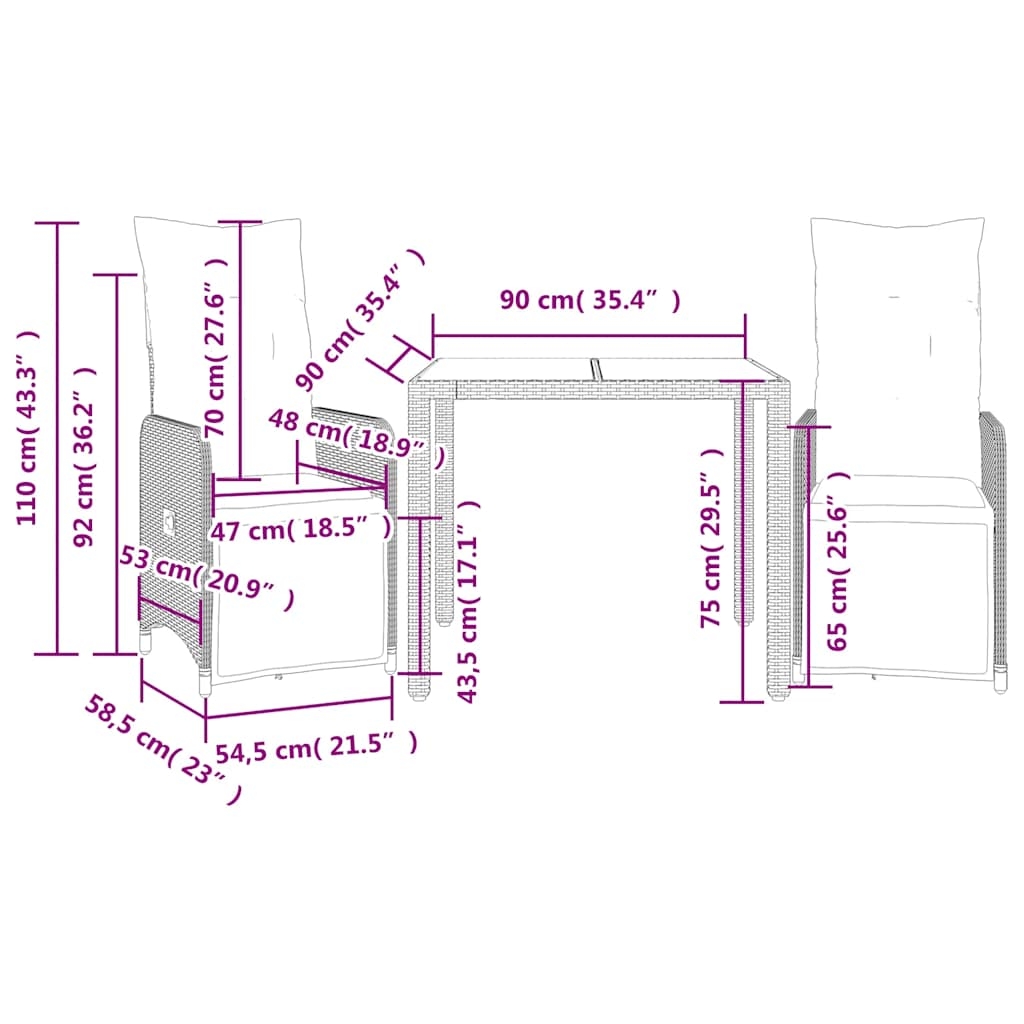 Genieße einen Kaffee oder unterhalte dich mit deiner Familie und deinen Freunden im Garten, Hinterhof oder auf dem Balkon mit diesem bequemen Bistro-Set! Langlebiges Material: PE-Rattan, auch als Poly Rattan bekannt, ist ein robustes, pflegeleichtes synthetisches Material, das die Optik von natürlichem Rattan aufweist. Es kennzeichnet sich durch ein geringes Eigengewicht und lässt sich einfach reinigen. Aufgrund seiner Haltbarkeit und Witterungsbeständigkeit wird es häufig bei der Herstellung von Gartenmöbeln verwendet.Verstellbare Rückenlehne und verstellbares Fußteil: Der Gartensessel ist mit einem Griff versehen. So kannst du die Rückenlehne und das Fußteil durch Ziehen des Griffs verstellen und sie danach schnell wieder in ihre ursprüngliche Position bringen.Bequemes Sitzerlebnis: Dieser Gartensessel mit dick gepolsterten Kissen bietet ein angenehmes Sitzgefühl.Abnehmbarer und waschbarer Bezug: Die Sitzkissen verfügen über abnehmbare Bezüge, die sich ganz einfach waschen und reinigen lassen. Dank der Klappen an der Rückseite können die Rückenkissen ganz einfach an den Rückenlehnen befestigt werden.Tischplatte aus Glas: Die Tischplatte des Gartentisches besteht aus starkem und langlebigem Hartglas, sodass sie leicht mit einem feuchten Tuch gereinigt werden kann und deinem Außenbereich einen Hauch von Eleganz verleiht. Gut zu wissen:Wir empfehlen dir, deine Gartenmöbel mit einer wasserdichten Hülle zu schützen, um lange Zeit eine ansprechende Optik aufzuweisen.