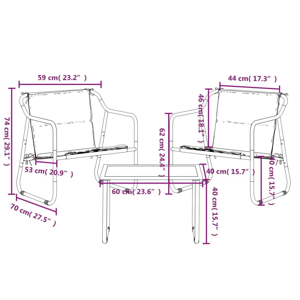 Mit seinem eleganten und modernen Design ist dieses trendige Garten-Lounge-Set eine großartige Wahl zum Entspannen in deinem Garten. Langlebiges Material: Textilene lässt die Luft frei durchströmen und ist resistent gegen UV-Strahlen. Dadurch ist Textilene eine ideale Wahl für heißes Wetter. Als langlebiges und strapazierfähiges Material ist es sehr widerstandsfähig gegen Risse, Durchstiche und Schimmelbildung.Robuster und stabiler Rahmen: Die Stahlrahmen machen das Lounge-Set robust und stabil und somit für den täglichen Gebrauch im Freien bestens geeignet.Bequemes Sitzerlebnis: Der Stuhl mit seiner schrägen Rückenlehne und der tiefen Sitzfläche ist perfekt für entspannte Stunden im Outdoor-Bereich. Außerdem sorgen die dick gepolsterte Kissen für hohen Sitzkomfort.Praktischer Tisch: Der robuste Tisch bietet den perfekten Platz für Speisen, Getränke und verschiedene Dekoartikel. Hinweis:Damit deine Gartenmöbel lange schön bleiben, empfehlen wir dir, sie mit einer wasserdichten Hülle zu schützen.