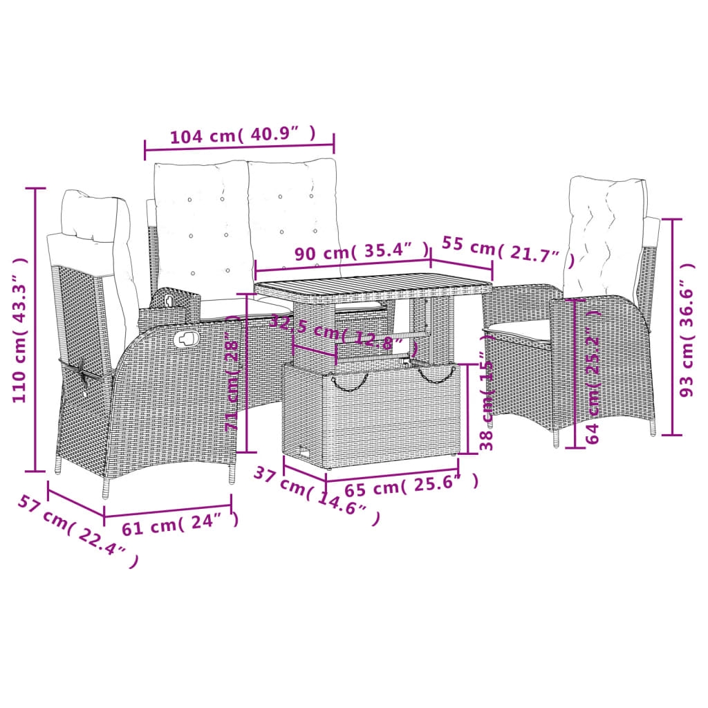 - Abmessungen in Sitzposition: 104 x 59 x 93 cm (B x T x H)