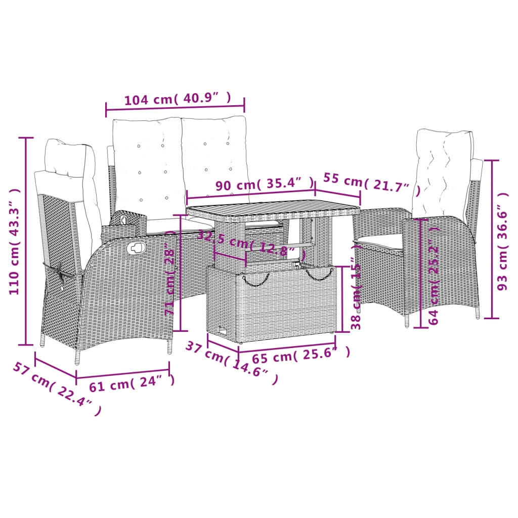 Diese Garten-Essgruppe ist eine ideale Wahl für Mahlzeiten im Freien oder einfach nur zum Entspannen im Garten, Hinterhof oder auf der Terrasse. Langlebiges Material: PE-Rattan, auch als Poly Rattan bekannt, ist ein robustes, pflegeleichtes synthetisches Material, das die Optik von natürlichem Rattan aufweist. Es kennzeichnet sich durch ein geringes Eigengewicht und lässt sich einfach reinigen. Aufgrund seiner Haltbarkeit und Witterungsbeständigkeit wird es häufig bei der Herstellung von Gartenmöbeln verwendet.Verstellbare Rückenlehne: Der Gartensessel ist mit einem Griff versehen. So kannst du die Rückenlehne durch Ziehen des Griffs verstellen und sie danach schnell wieder in ihre ursprüngliche Position bringen.Verstellbare Tischplatte: Die Tischplatte lässt sich anheben, um den Gartentisch höher zu machen und ihn von einem Couchtisch in einen Esstisch zu verwandeln. Er eignet sich daher perfekt für Gäste oder Mahlzeiten im Freien.Abnehmbarer und waschbarer Bezug: Die Sitzkissen verfügen über abnehmbare Bezüge, die sich ganz einfach waschen und reinigen lassen. Dank der Klappen an der Rückseite können die Rückenkissen ganz einfach an den Rückenlehnen befestigt werden.Bequemes Sitzerlebnis: Dieser Gartensessel mit dick gepolsterten Kissen bietet ein angenehmes Sitzgefühl. Gut zu wissen:Wir empfehlen dir, deine Gartenmöbel mit einer wasserdichten Hülle zu schützen, um lange Zeit eine ansprechende Optik aufzuweisen.