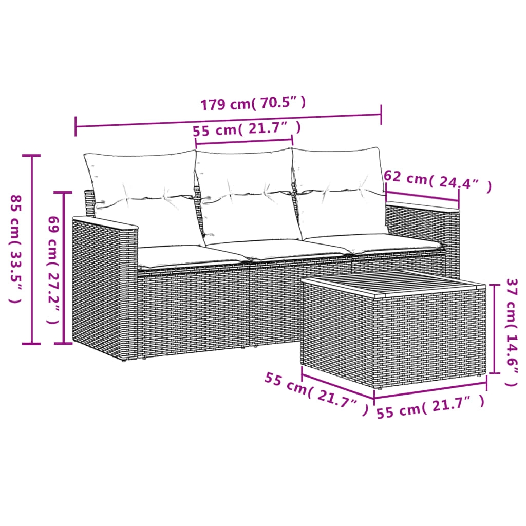 Diese Garten-Sofagarnitur ist die perfekte Ergänzung zu deinem Garten, deiner Terrasse oder deinem Innenhof. Sie bietet einen bequemen und einladenden Platz, um mit Familie und Freunden zu plaudern oder dich einfach nur zu entspannen und das Leben im Freien zu genießen. Langlebiges Material: PE-Rattan, auch als Poly Rattan bekannt, ist ein robustes, pflegeleichtes synthetisches Material, das die Optik von natürlichem Rattan aufweist. Es kennzeichnet sich durch ein geringes Eigengewicht und lässt sich einfach reinigen. Aufgrund seiner Haltbarkeit und Witterungsbeständigkeit wird es häufig bei der Herstellung von Gartenmöbeln verwendet.Stauraum mit wasserfestem Beutel: Das Gartensofa verfügen über ein Staufach unter der Sitzfläche, das mit einem wasserfesten Beutel zur Aufbewahrung von Kissen, Spielzeug und anderen Gegenständen versehen ist. Der Innenbeutel lässt sich mit Klettverschlüssen sicher und stabil an den Gartenmöbeln befestigen.Stabile und pflegeleichte Tischplatte: Dieser Gartentisch besitzt eine Tischplatte aus Akazienholz, die robust und langlebig ist und sich leicht mit einem feuchten Tuch reinigen lässt.Abnehmbarer und waschbarer Bezug: Diese Sitzkissen verfügen über abnehmbare Bezüge für einfaches Waschen und Pflegen.Modulares Design: Dank des modularen Designs lassen sich die Gartenmöbel völlig flexibel und einfach umstellen, um deinen Außenbereich ganz individuell zu gestalten. Gut zu wissen:Wir empfehlen dir, deine Gartenmöbel mit einer wasserdichten Hülle zu schützen, um lange Zeit eine ansprechende Optik aufzuweisen.