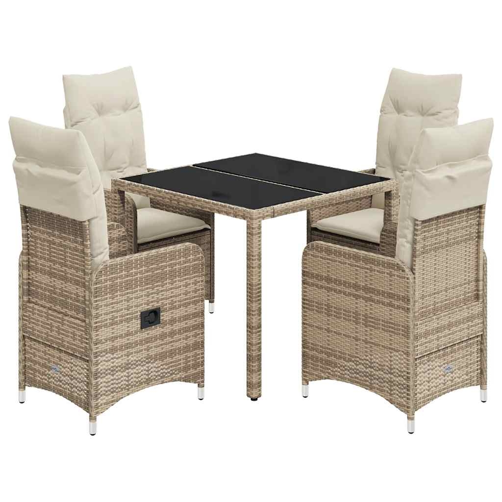 Genieße einen Kaffee oder unterhalte dich mit deiner Familie und deinen Freunden im Garten, Hinterhof oder auf dem Balkon mit diesem bequemen Bistro-Set! Langlebiges Material: PE-Rattan, auch als Poly Rattan bekannt, ist ein robustes, pflegeleichtes synthetisches Material, das die Optik von natürlichem Rattan aufweist. Es kennzeichnet sich durch ein geringes Eigengewicht und lässt sich einfach reinigen. Aufgrund seiner Haltbarkeit und Witterungsbeständigkeit wird es häufig bei der Herstellung von Gartenmöbeln verwendet.Verstellbare Rückenlehne: Der Gartensessel ist mit einem Griff versehen. So kannst du die Rückenlehne durch Ziehen des Griffs verstellen und sie danach schnell wieder in ihre ursprüngliche Position bringen.Bequemes Sitzerlebnis: Dieser Gartensessel mit dick gepolsterten Kissen bietet ein angenehmes Sitzgefühl.Abnehmbarer und waschbarer Bezug: Die Sitzkissen verfügen über abnehmbare Bezüge, die sich ganz einfach waschen und reinigen lassen. Dank der Klappen an der Rückseite können die Rückenkissen ganz einfach an den Rückenlehnen befestigt werden.Tischplatte aus Glas: Die Tischplatte des Gartentisches besteht aus starkem und langlebigem Hartglas, sodass sie leicht mit einem feuchten Tuch gereinigt werden kann und deinem Außenbereich einen Hauch von Eleganz verleiht. Gut zu wissen:Wir empfehlen dir, deine Gartenmöbel mit einer wasserdichten Hülle zu schützen, um lange Zeit eine ansprechende Optik aufzuweisen.