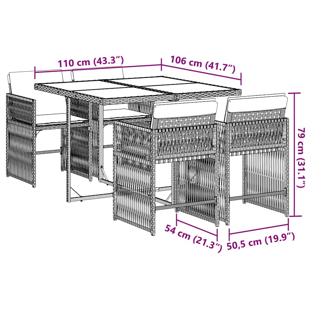 Diese Garten-Essgruppe ist eine ideale Wahl für Mahlzeiten im Freien oder einfach nur zum Entspannen im Garten, Hinterhof oder auf der Terrasse. Langlebiges Material: PE-Rattan, auch als Poly Rattan bekannt, ist ein robustes, pflegeleichtes synthetisches Material, das die Optik von natürlichem Rattan aufweist. Es kennzeichnet sich durch ein geringes Eigengewicht und lässt sich einfach reinigen. Aufgrund seiner Haltbarkeit und Witterungsbeständigkeit wird es häufig bei der Herstellung von Gartenmöbeln verwendet.Platzsparende Aufbewahrung: Dank der klappbaren Rückenlehnen lassen sich die Stühle unter dem Tisch verstauen, sodass die gesamte Essgruppe bei Nichtgebrauch eine platzsparende Würfelform bildet.Bequemes Sitzerlebnis: Dieser Gartensessel mit dick gepolsterten Kissen bietet ein angenehmes Sitzgefühl.Abnehmbarer und waschbarer Bezug: Die Sitzkissen verfügen über abnehmbare Bezüge, die sich ganz einfach waschen und reinigen lassen. Dank der Klappen an der Rückseite können die Kissen ganz einfach an den Rückenlehnen befestigt werden.Tischplatte aus Glas: Die Tischplatte des Gartentisches besteht aus starkem und langlebigem Hartglas, sodass sie leicht mit einem feuchten Tuch gereinigt werden kann und deinem Außenbereich einen Hauch von Eleganz verleiht. Gut zu wissen:Wir empfehlen dir, deine Gartenmöbel mit einer wasserdichten Hülle zu schützen, um lange Zeit eine ansprechende Optik aufzuweisen.