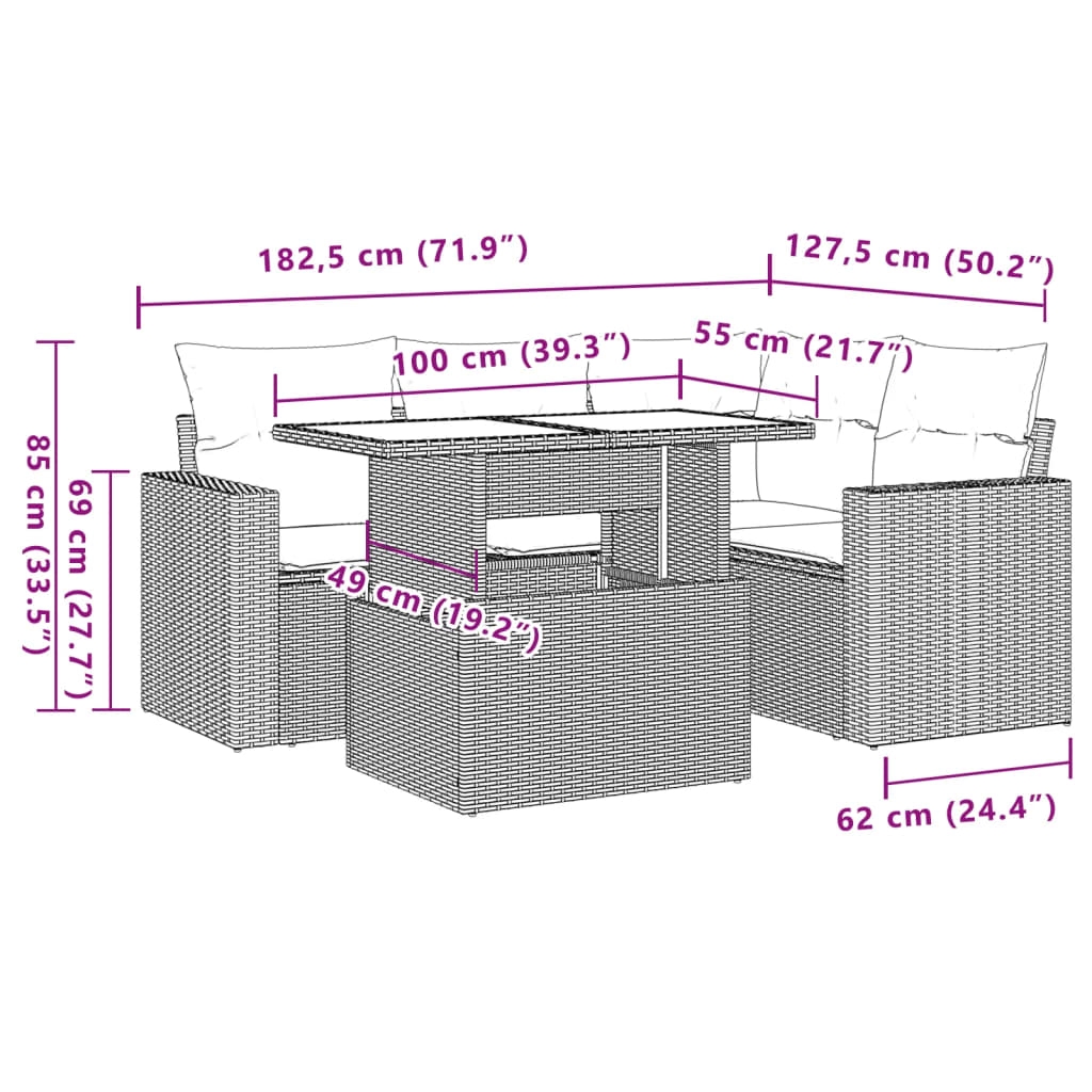 Diese Garten-Sofagarnitur ist die perfekte Ergänzung zu deinem Garten, deiner Terrasse oder deinem Innenhof. Sie bietet einen bequemen und einladenden Platz, um mit Familie und Freunden zu plaudern oder dich einfach nur zu entspannen und das Leben im Freien zu genießen. Langlebiges Material: PE-Rattan, auch als Poly Rattan bekannt, ist ein robustes, pflegeleichtes synthetisches Material, das die Optik von natürlichem Rattan aufweist. Es kennzeichnet sich durch ein geringes Eigengewicht und lässt sich einfach reinigen. Aufgrund seiner Haltbarkeit und Witterungsbeständigkeit wird es häufig bei der Herstellung von Gartenmöbeln verwendet.Verstellbare Tischplatte: Die Tischplatte lässt sich anheben, um den Gartentisch höher zu machen und ihn von einem Couchtisch in einen Esstisch zu verwandeln. Er eignet sich daher perfekt für Gäste oder Mahlzeiten im Freien.Bequemes Sitzerlebnis: Dieser Gartensessel mit dick gepolsterten Kissen bietet ein angenehmes Sitzgefühl.Abnehmbarer und waschbarer Bezug: Diese Sitzkissen verfügen über abnehmbare Bezüge für einfaches Waschen und Pflegen.Modulares Design: Dank des modularen Designs lassen sich die Gartenmöbel völlig flexibel und einfach umstellen, um deinen Außenbereich ganz individuell zu gestalten. Gut zu wissen:Wir empfehlen dir, deine Gartenmöbel mit einer wasserdichten Hülle zu schützen, um lange Zeit eine ansprechende Optik aufzuweisen.