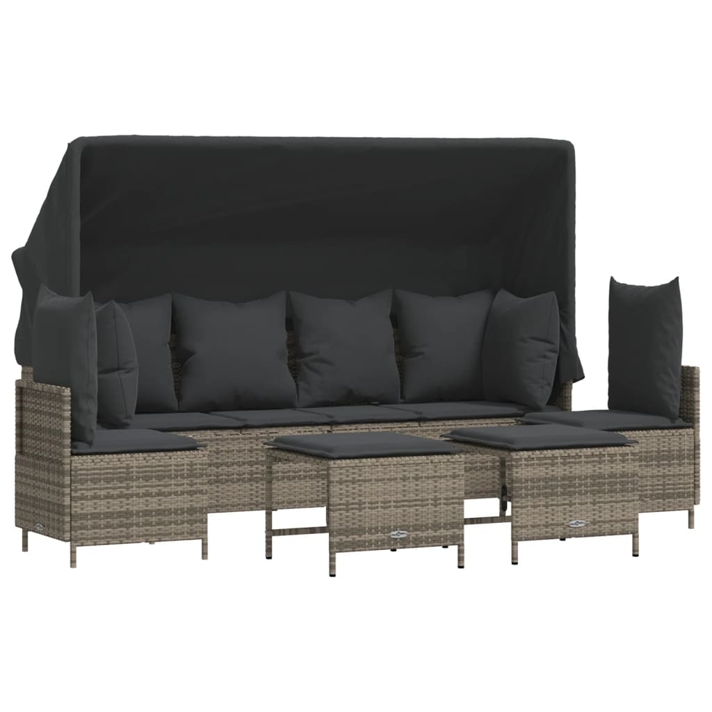 Diese Garten-Sofagarnitur ist die perfekte Ergänzung zu deinem Garten, deiner Terrasse oder deinem Innenhof. Sie bietet einen bequemen und einladenden Platz, um mit Familie und Freunden zu plaudern oder dich einfach nur zu entspannen und das Leben im Freien zu genießen. Langlebiges Material: PE-Rattan, auch als Poly Rattan bekannt, ist ein robustes, pflegeleichtes synthetisches Material, das die Optik von natürlichem Rattan aufweist. Es kennzeichnet sich durch ein geringes Eigengewicht und lässt sich einfach reinigen. Aufgrund seiner Haltbarkeit und Witterungsbeständigkeit wird es häufig bei der Herstellung von Gartenmöbeln verwendet.Verstellbare Rückenlehne und Fußstütze: Dank der 3-fach verstellbaren Rückenlehne und des 2-fach verstellbaren Fußteils findest du stets ganz einfach die bequemsten und angenehmste Position zum Entspannen.Ausziehbares Sonnendach: Dank der ausziehbaren Sonnendaches genießt du den ganzen Tag über ein kühles und angenehmes Plätzchen in deinem Außenbereich.Bequemes Sitzerlebnis: Dieser Gartensessel mit dick gepolsterten Kissen bietet ein angenehmes Sitzgefühl.Vielseitiger Fußhocker: Der Hocker ist vielseitig einsetzbar und dient als bequeme Fußstütze beim Entspannen auf dem Sofa oder als zusätzlicher Sitzplatz in deinem Garten. Gut zu wissen:Wir empfehlen dir, deine Gartenmöbel mit einer wasserdichten Hülle zu schützen, um lange Zeit eine ansprechende Optik aufzuweisen.