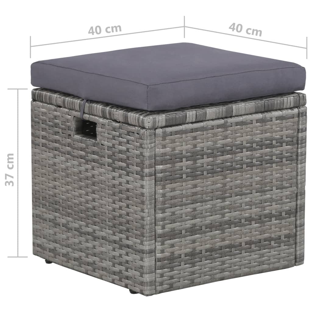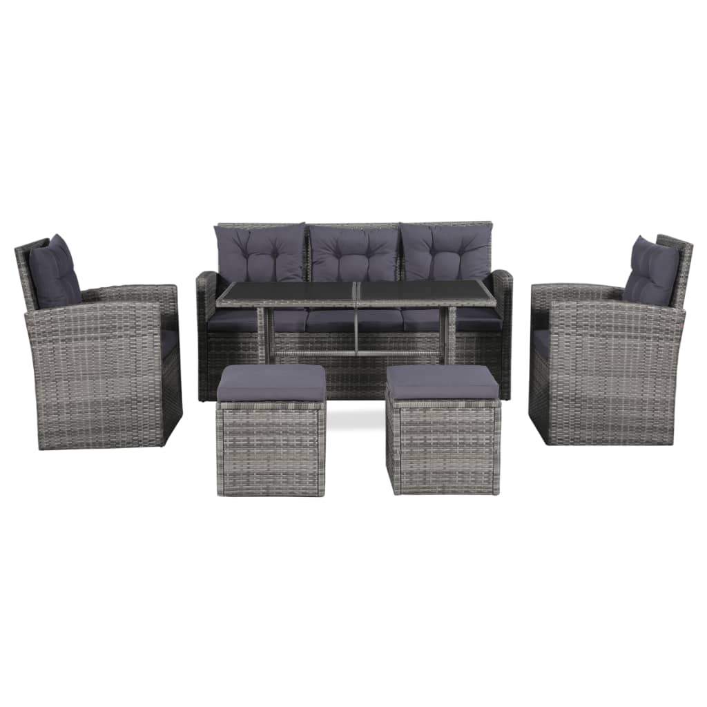 Dieses Poly Rattan Sofa-Set, bestehend aus 1 dreisitzigen Sofa, 2 Sessel, 1 Tisch, 2 Hocker, 4 Rückenkissen und 5 Sitzkissen, bietet eine stilvolle Sitzecke für Ihren Garten oder Ihre Terrasse. Dank des wasserfesten PE-Rattans ist diese Gartenlounge-Ecke pflegeleicht, strapazierfähig und für den täglichen Gebrauch im Außenbereich geeignet. Die pulverbeschichteten Stahlrahmen verleihen dem Gartenmöbelset Stabilität und Langlebigkeit. Dieses Set wird außerdem mit äußerst bequemen, dick gepolsterten Sitz- und Rückenkissen geliefert, die für den ultimativen Sitzkomfort sorgen. Die pflegeleichten Polyesterbezüge können auch abgenommen und gewaschen werden. Dieses Set ist einfach zu montieren. Hinweis: Wir empfehlen, das Set bei Regen, Schnee und Frost abzudecken, um eine lange Lebensdauer zu gewährleisten.