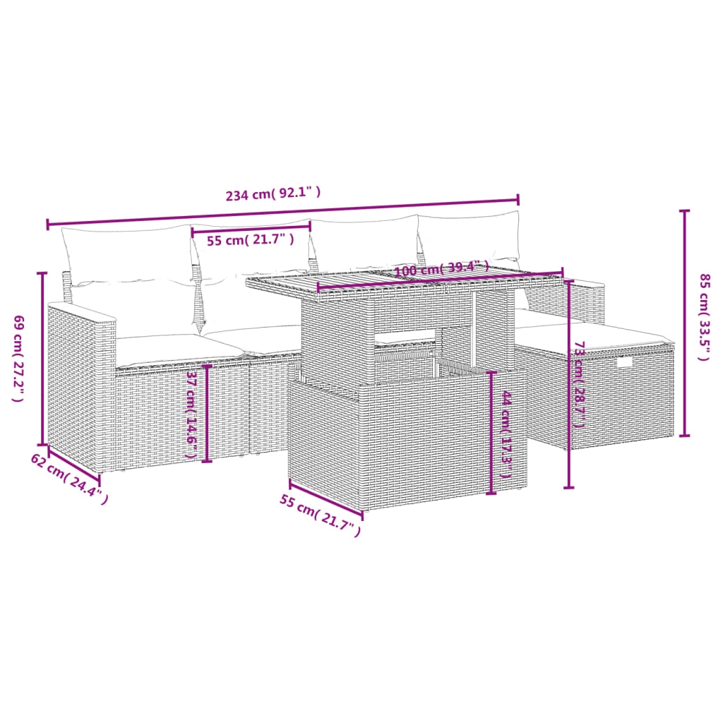 Diese Garten-Sofagarnitur ist die perfekte Ergänzung zu deinem Garten, deiner Terrasse oder deinem Innenhof. Sie bietet einen bequemen und einladenden Platz, um mit Familie und Freunden zu plaudern oder dich einfach nur zu entspannen und das Leben im Freien zu genießen. Langlebiges Material: PE-Rattan, auch als Poly Rattan bekannt, ist ein robustes, pflegeleichtes synthetisches Material, das die Optik von natürlichem Rattan aufweist. Es kennzeichnet sich durch ein geringes Eigengewicht und lässt sich einfach reinigen. Aufgrund seiner Haltbarkeit und Witterungsbeständigkeit wird es häufig bei der Herstellung von Gartenmöbeln verwendet.Verstellbare Tischplatte: Die Tischplatte lässt sich anheben, um den Gartentisch höher zu machen und ihn von einem Couchtisch in einen Esstisch zu verwandeln. Der Tisch eignet sich daher perfekt für Gäste oder Mahlzeiten im Freien.Abnehmbarer und waschbarer Bezug: Diese Sitzkissen verfügen über abnehmbare Bezüge für einfaches Waschen und Pflegen.Modulares Design: Dank des modularen Designs lassen sich die Gartenmöbel völlig flexibel und einfach umstellen, um deinen Außenbereich ganz individuell zu gestalten. Gut zu wissen:Wir empfehlen dir, deine Gartenmöbel mit einer wasserdichten Hülle zu schützen, um lange Zeit eine ansprechende Optik aufzuweisen.