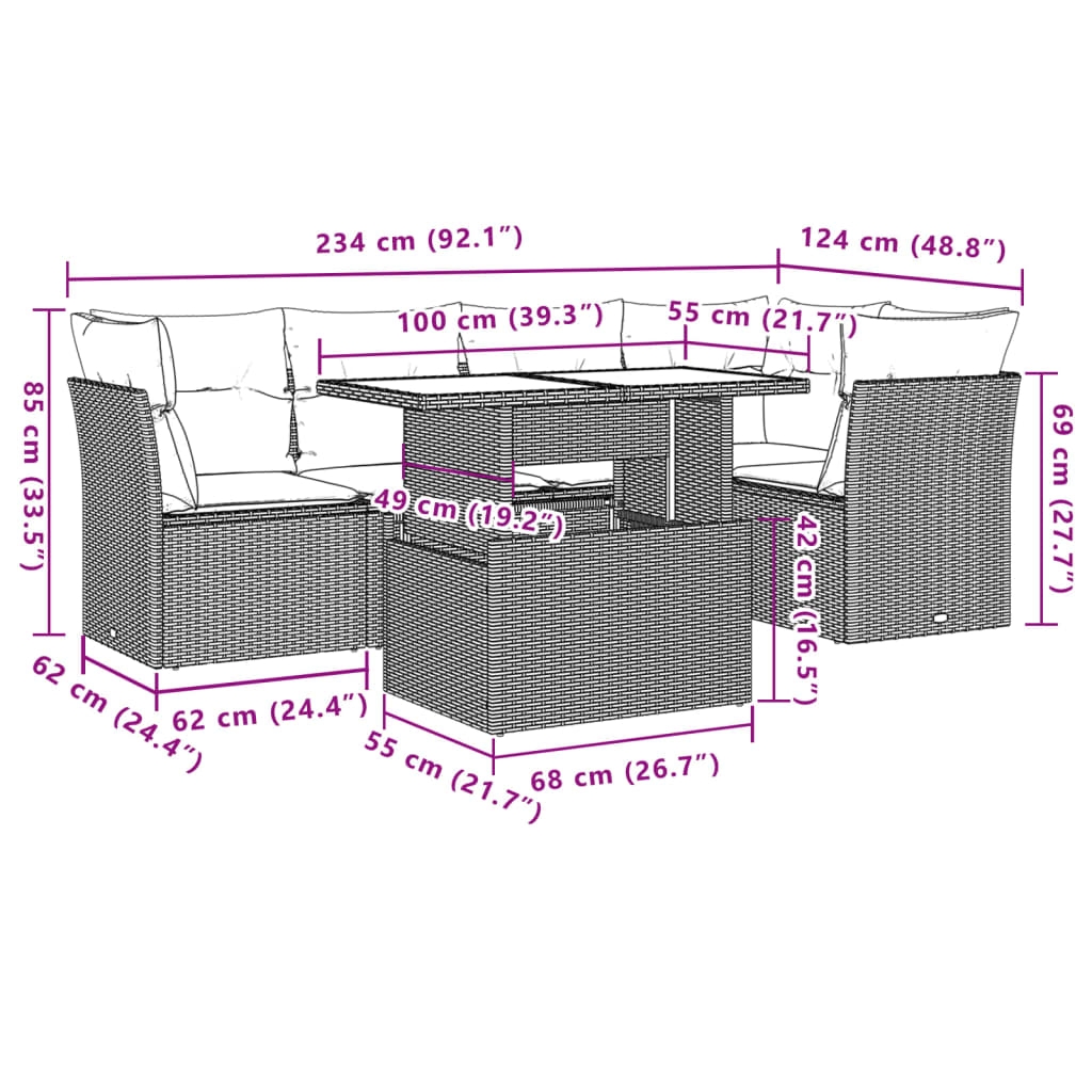 Diese Garten-Sofagarnitur ist die perfekte Ergänzung zu deinem Garten, deiner Terrasse oder deinem Innenhof. Sie bietet einen bequemen und einladenden Platz, um mit Familie und Freunden zu plaudern oder dich einfach nur zu entspannen und das Leben im Freien zu genießen. Langlebiges Material: PE-Rattan, auch als Poly Rattan bekannt, ist ein robustes, pflegeleichtes synthetisches Material, das die Optik von natürlichem Rattan aufweist. Es kennzeichnet sich durch ein geringes Eigengewicht und lässt sich einfach reinigen. Aufgrund seiner Haltbarkeit und Witterungsbeständigkeit wird es häufig bei der Herstellung von Gartenmöbeln verwendet.Verstellbare Tischplatte: Die Tischplatte lässt sich anheben, um den Gartentisch höher zu machen und ihn von einem Couchtisch in einen Esstisch zu verwandeln. Er eignet sich daher perfekt für Gäste oder Mahlzeiten im Freien.Bequemes Sitzerlebnis: Dieser Gartensessel mit dick gepolsterten Kissen bietet ein angenehmes Sitzgefühl.Abnehmbarer und waschbarer Bezug: Diese Sitzkissen verfügen über abnehmbare Bezüge für einfaches Waschen und Pflegen.Modulares Design: Dank des modularen Designs lassen sich die Gartenmöbel völlig flexibel und einfach umstellen, um deinen Außenbereich ganz individuell zu gestalten. Gut zu wissen:Wir empfehlen dir, deine Gartenmöbel mit einer wasserdichten Hülle zu schützen, um lange Zeit eine ansprechende Optik aufzuweisen.